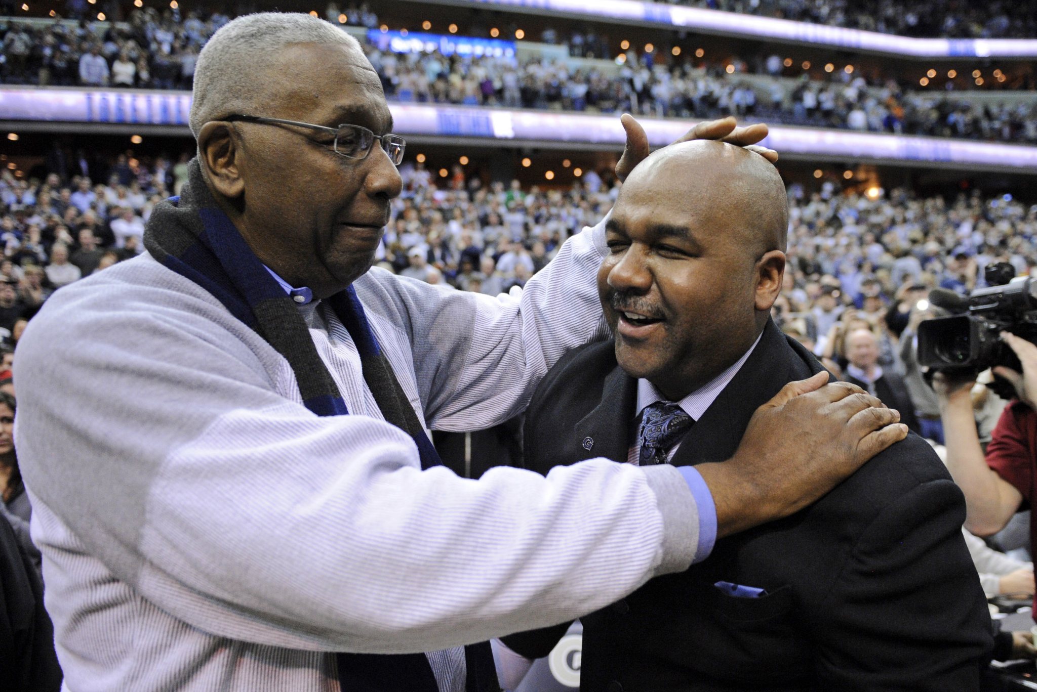 FILE - In this March 9, 2013, file photo, former Georgetown coach John Thompson Jr., left, congratulates his son Georgetown head coach John Thompson III, right, after the Hoya's 61-39 win over Syracuse in an NCAA college basketball game in Washington. Georgetown has fired basketball coach John Thompson III on Thursday, March 23, 2017, after two consecutive losing seasons at the school his father led to a national championship. (AP Photo/Nick Wass, File)