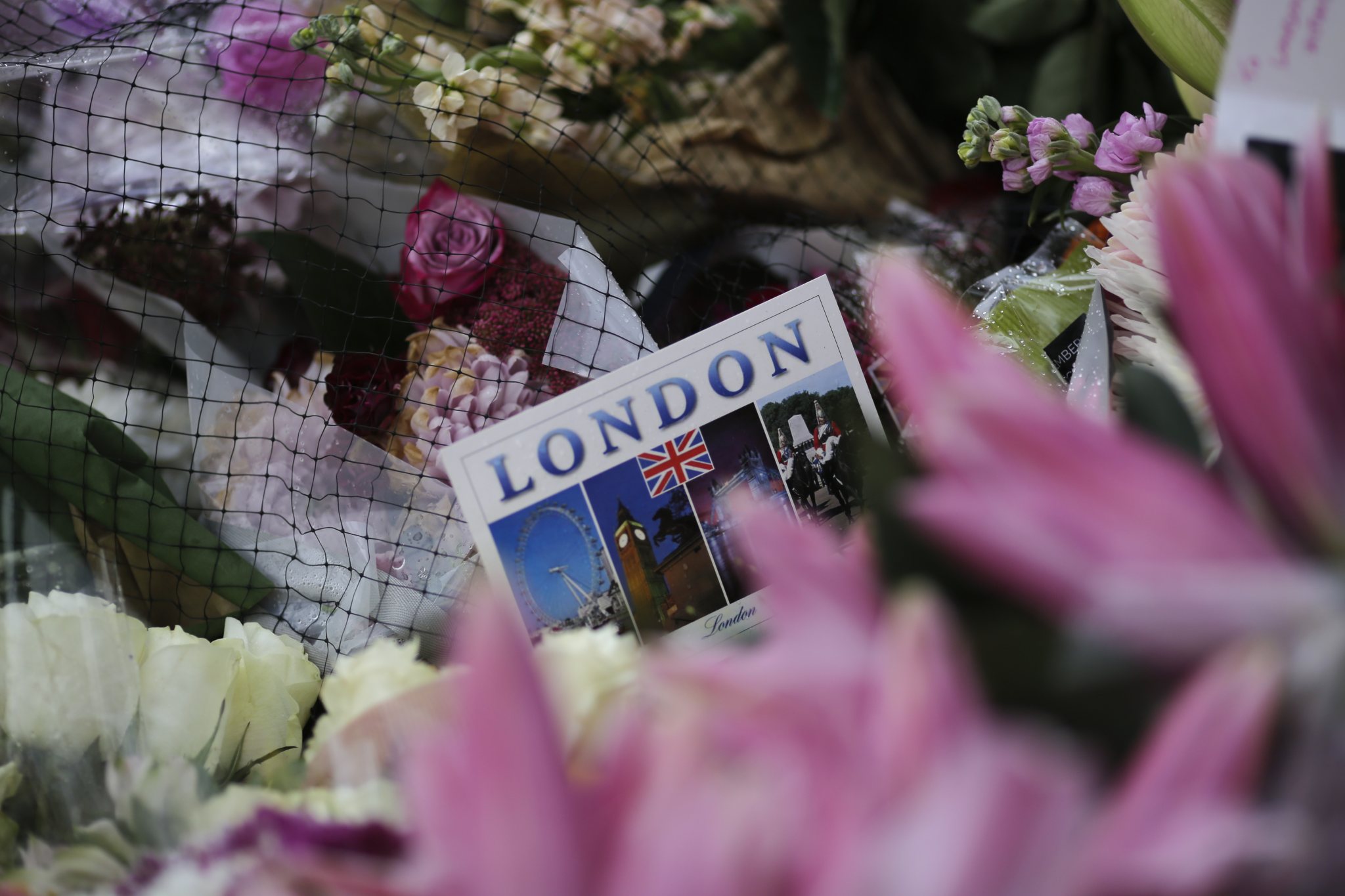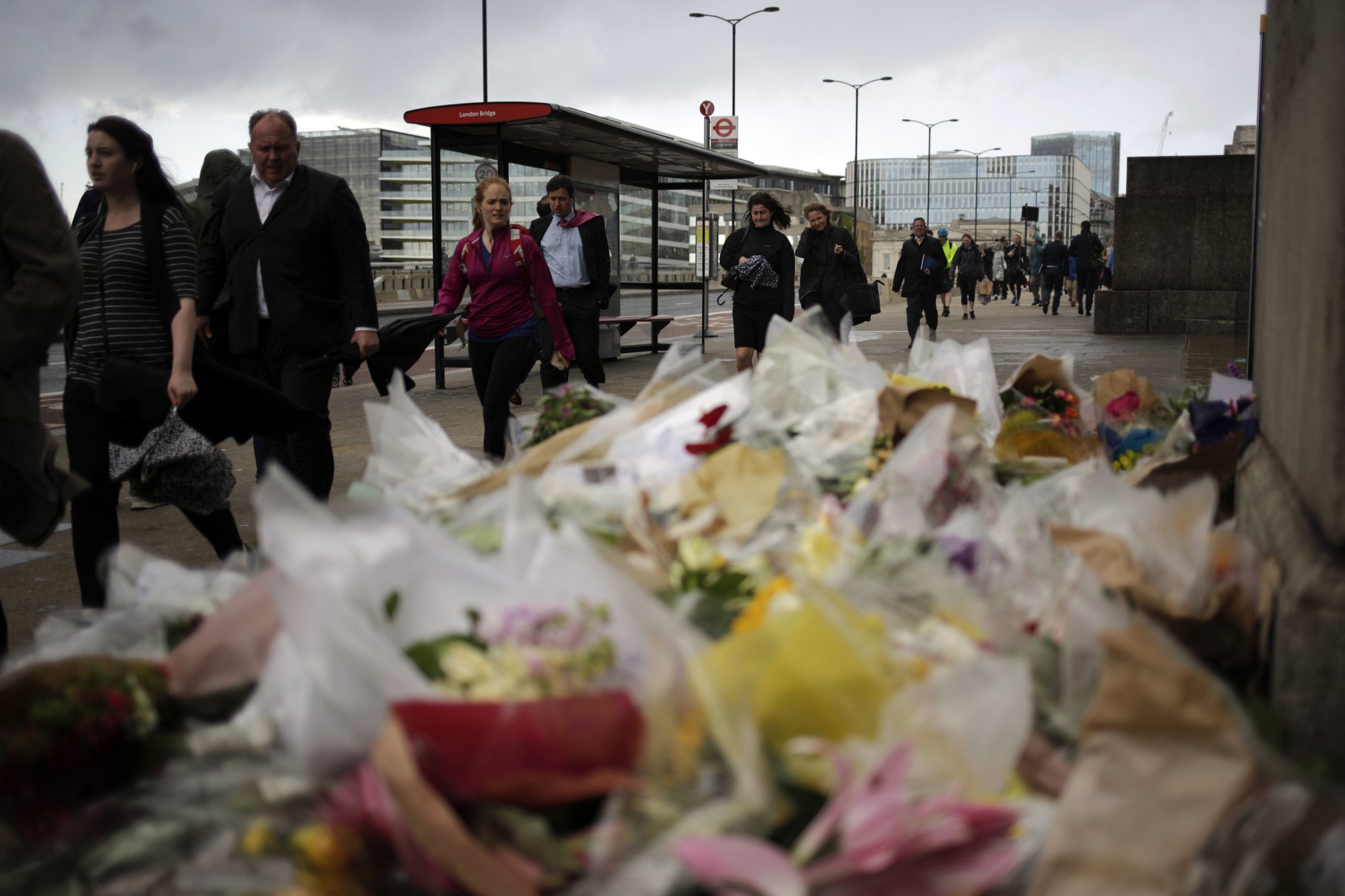 Pedestrians pass flowers on a memorial for victims at the London Bridge in London, Tuesday, June 6, 2017. British police on Tuesday named the third London Bridge attacker as an Italian national of Moroccan descent, and Italian officials said they had passed on their concerns about him to British intelligence officials last year. (AP Photo/Markus Schreiber)