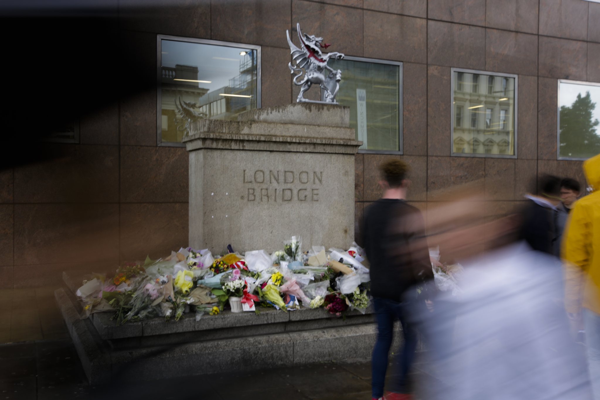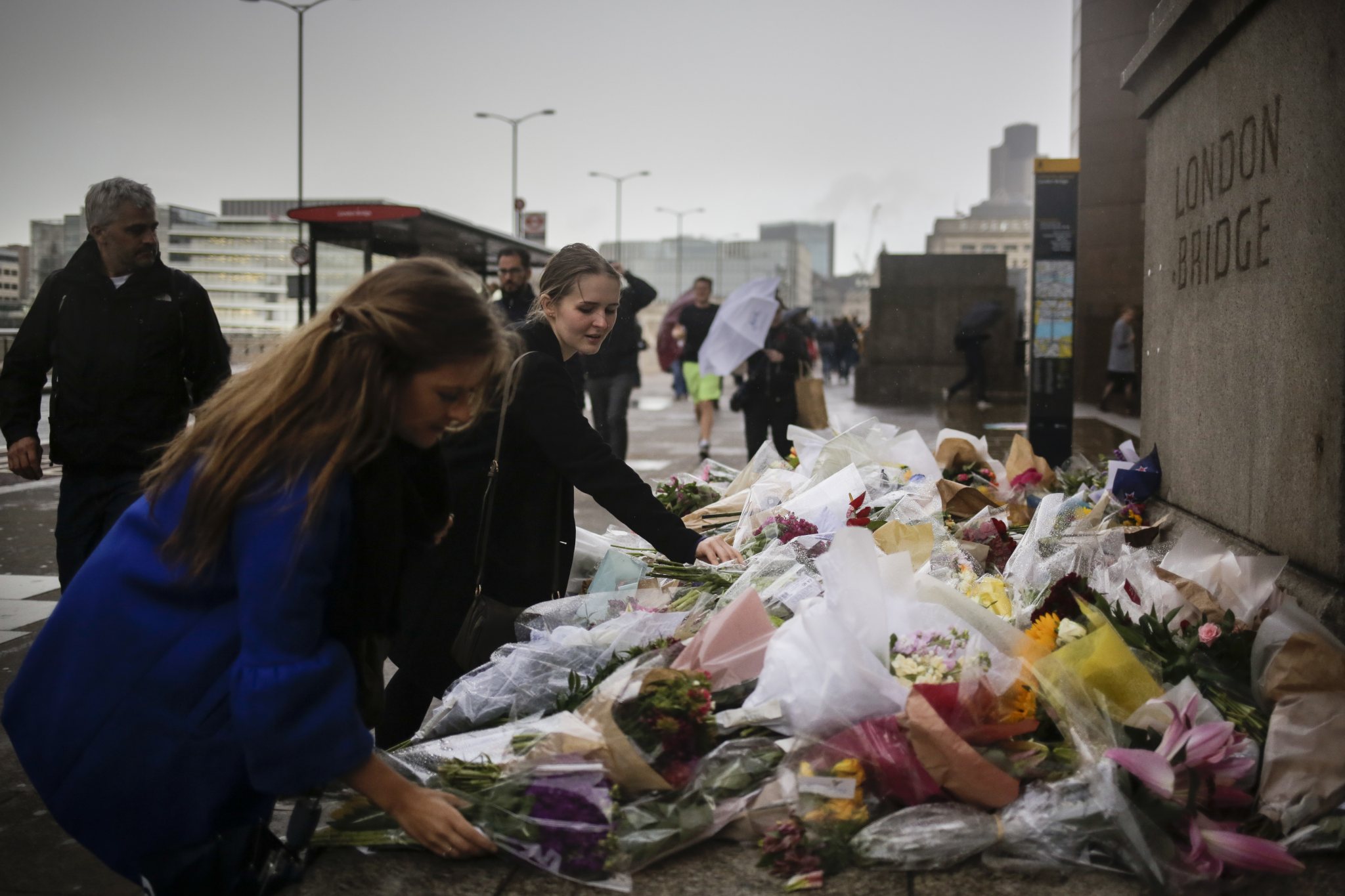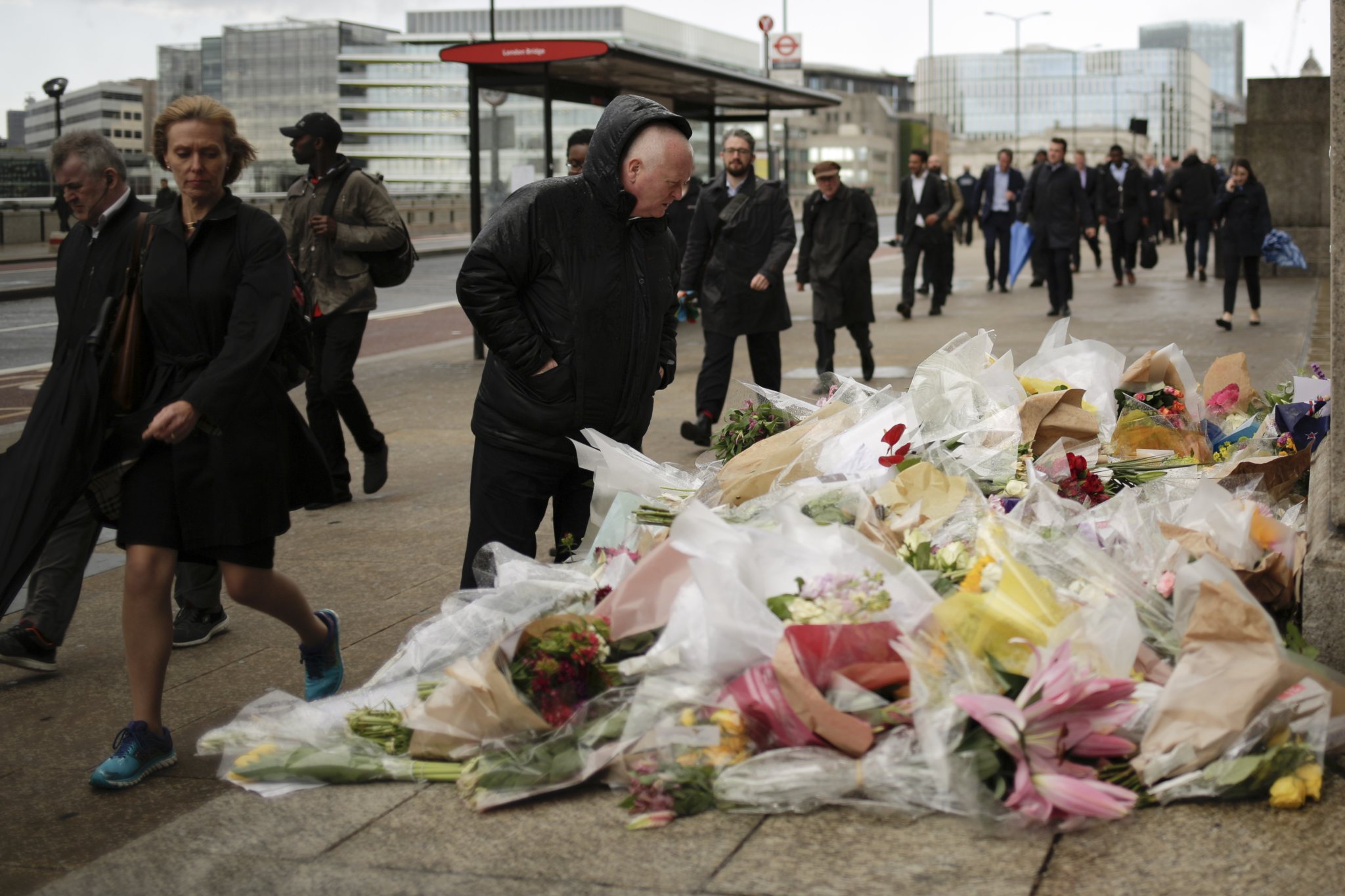 People look at floral tributes on London Bridge in London, Tuesday, June 6, 2017. British police on Tuesday named the third London Bridge attacker as an Italian national of Moroccan descent, and Italian officials said they had passed on their concerns about him to British intelligence officials last year. (AP Photo/Markus Schreiber)
