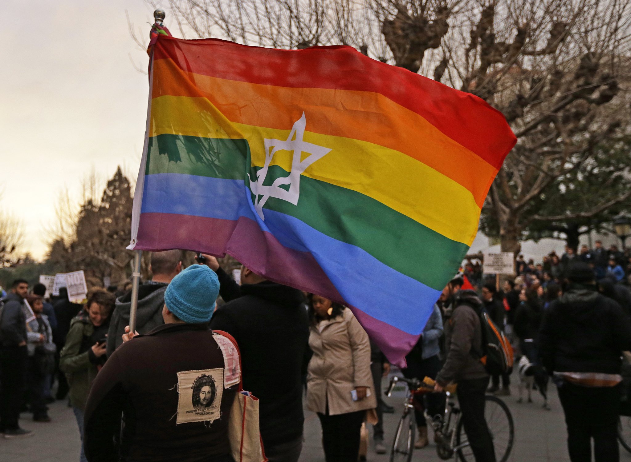 People protest the appearance of Breitbart News editor Milo Yiannopoulos on Wednesday, Feb. 1, 2017, in Berkeley, Calif. The University of California at Berkeley is bracing for major protests Wednesday against Yiannopoulos, a polarizing Breitbart News editor, on the last stop of a tour aimed at defying what he calls an epidemic of political correctness on college campuses. (AP Photo/Ben Margot)
