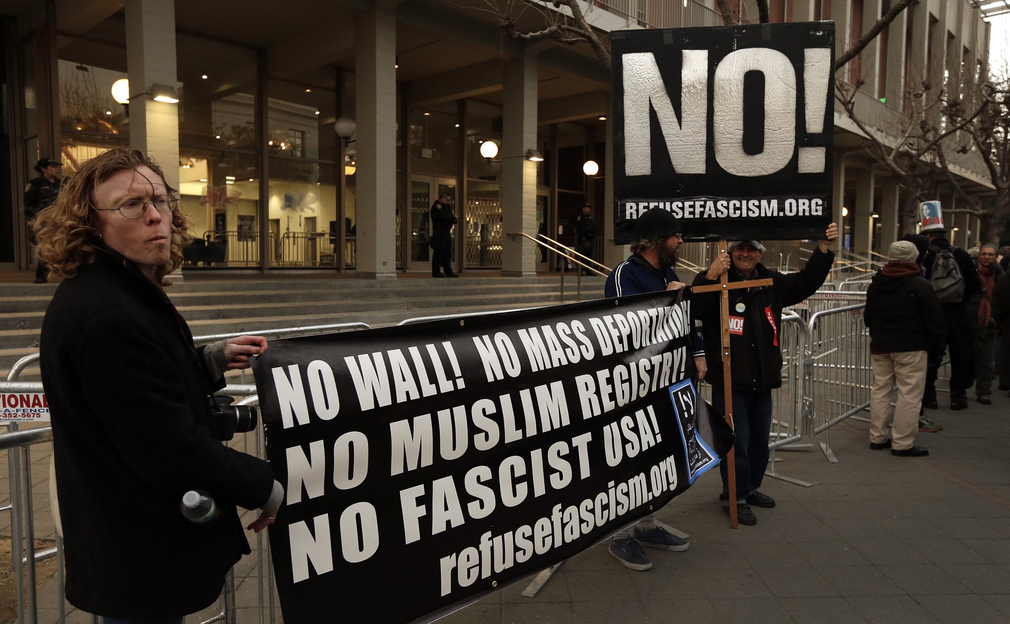 People protest the appearance of Breitbart News editor Milo Yiannopoulos on Wednesday, Feb. 1, 2017, in Berkeley, Calif. The University of California at Berkeley is bracing for major protests Wednesday against Milo Yiannopoulos, a polarizing Breitbart News editor, on the last stop of a tour aimed at defying what he calls an epidemic of political correctness on college campuses. (AP Photo/Ben Margot)