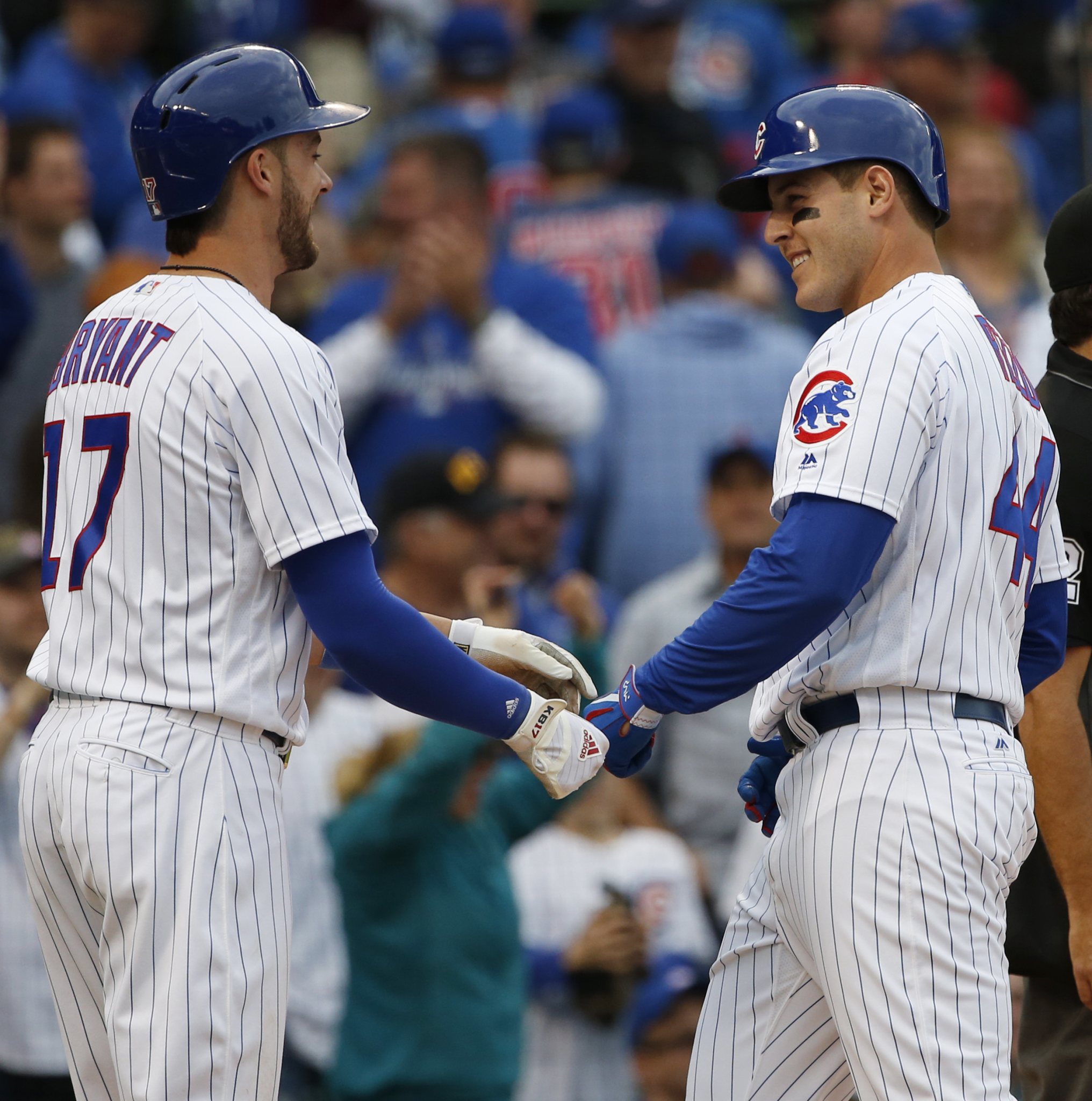 “He hasn’t really had to tell us anything like that; it’s just kind of been us and what we think as a group,” said third baseman Kris Bryant, who hit solo homers in the third and fifth innings, giving him 10 for the year. He also doubled and was hit twice by pitches. “It’s just a matter of time for us. Just a ton of really good at-bats throughout the whole game.”