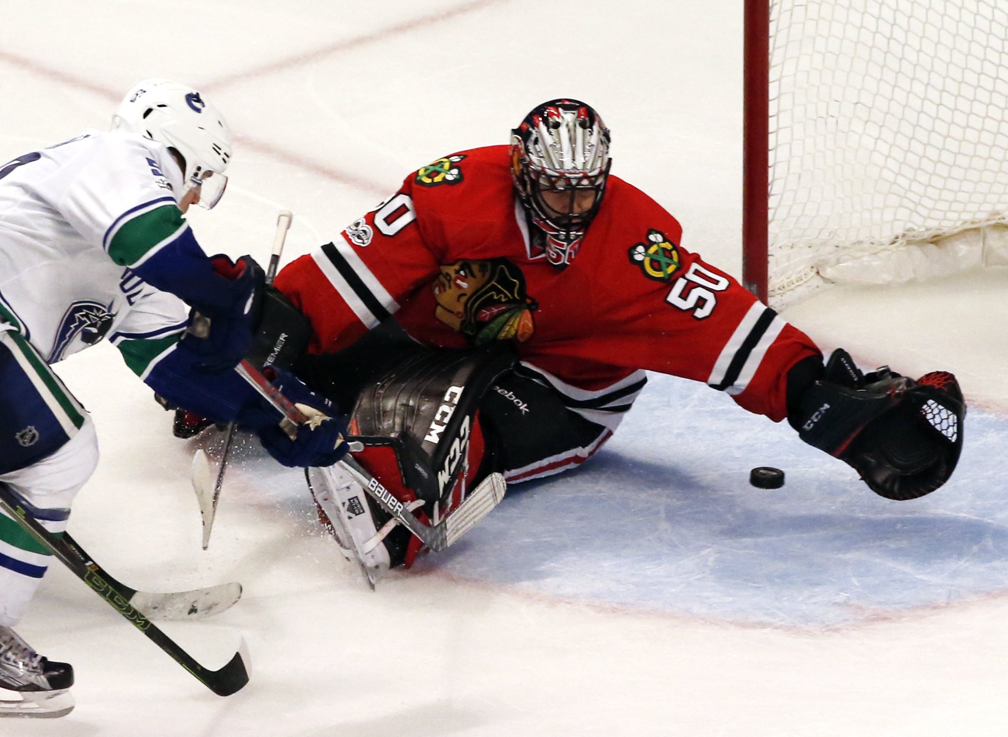 Corey Crawford made 25 saves, including one on a Daniel Sedin breakaway and 3 more from close range with Vancouver on two separate power plays in the second period. Crawford is 18-10-3 on the season, and he became the fourth goalie in Hawks history to reach 200 wins, joining Ed Belfour, Tony Esposito and Glenn Hall.