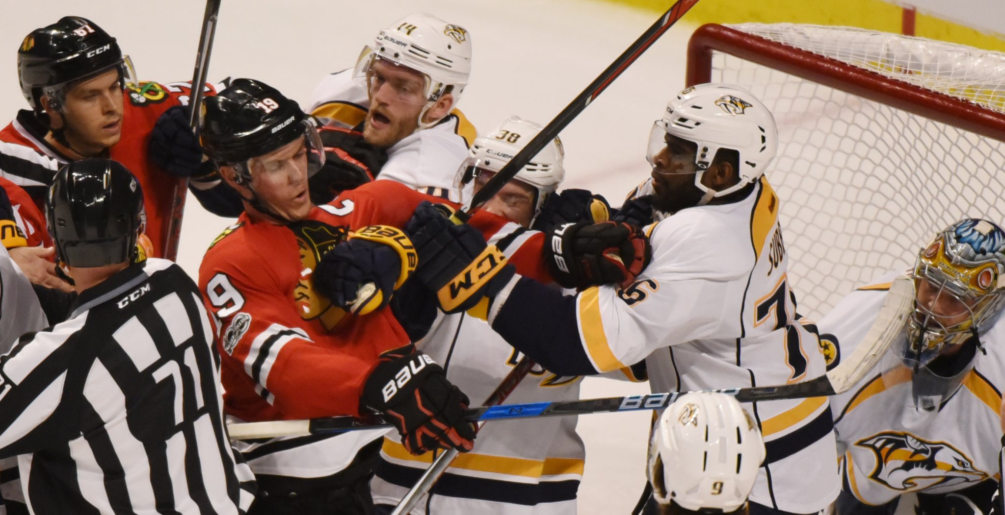 After sleepwalking through the rest of the first period, the Hawks controlled the flow of the game and had plenty of chances to knot the score. Kane had a pair of point-blank shots turned away by Rinne in the second period, and Marian Hossa also failed to convert on a shot in close after taking a pass from Ryan Hartman.