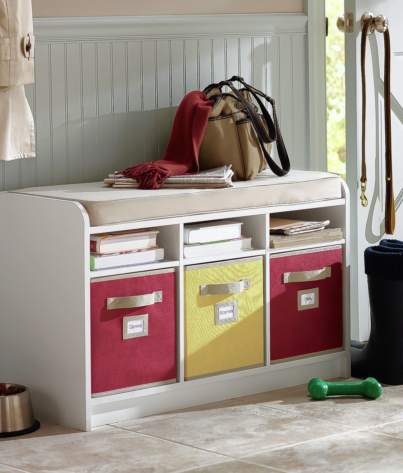 Once the area is marked, assign a narrow space within it for each family member. Add hooks, and a bench with cubbies or baskets underneath.