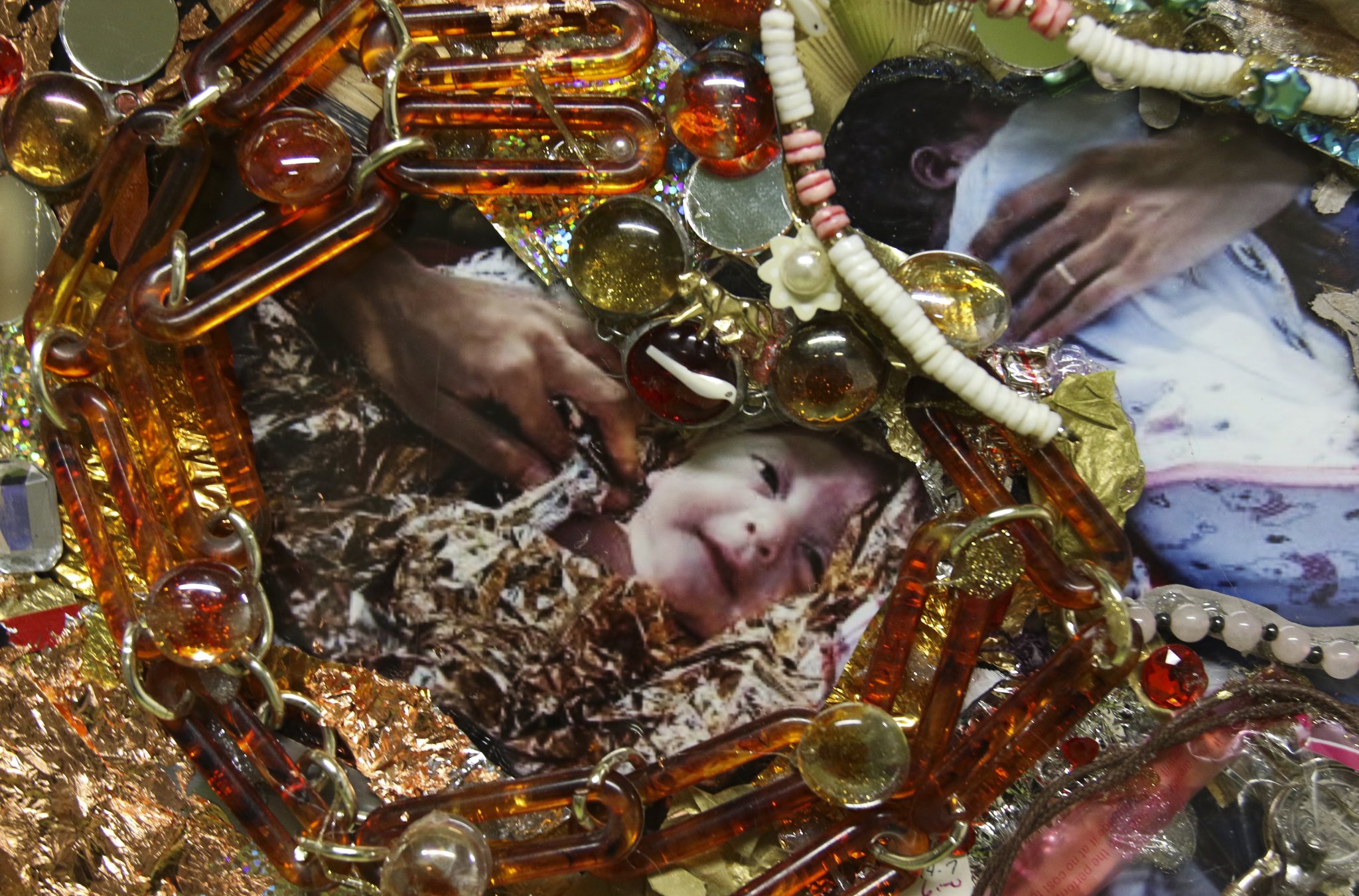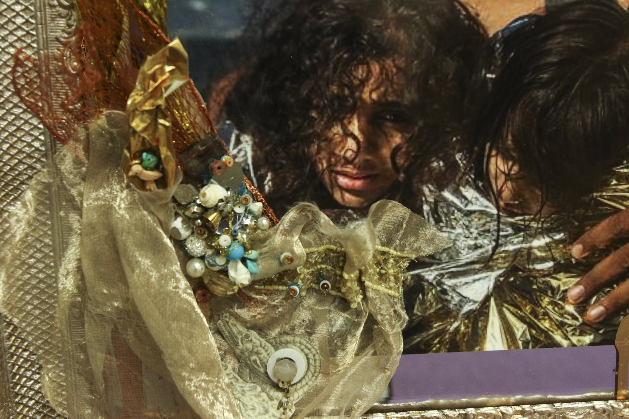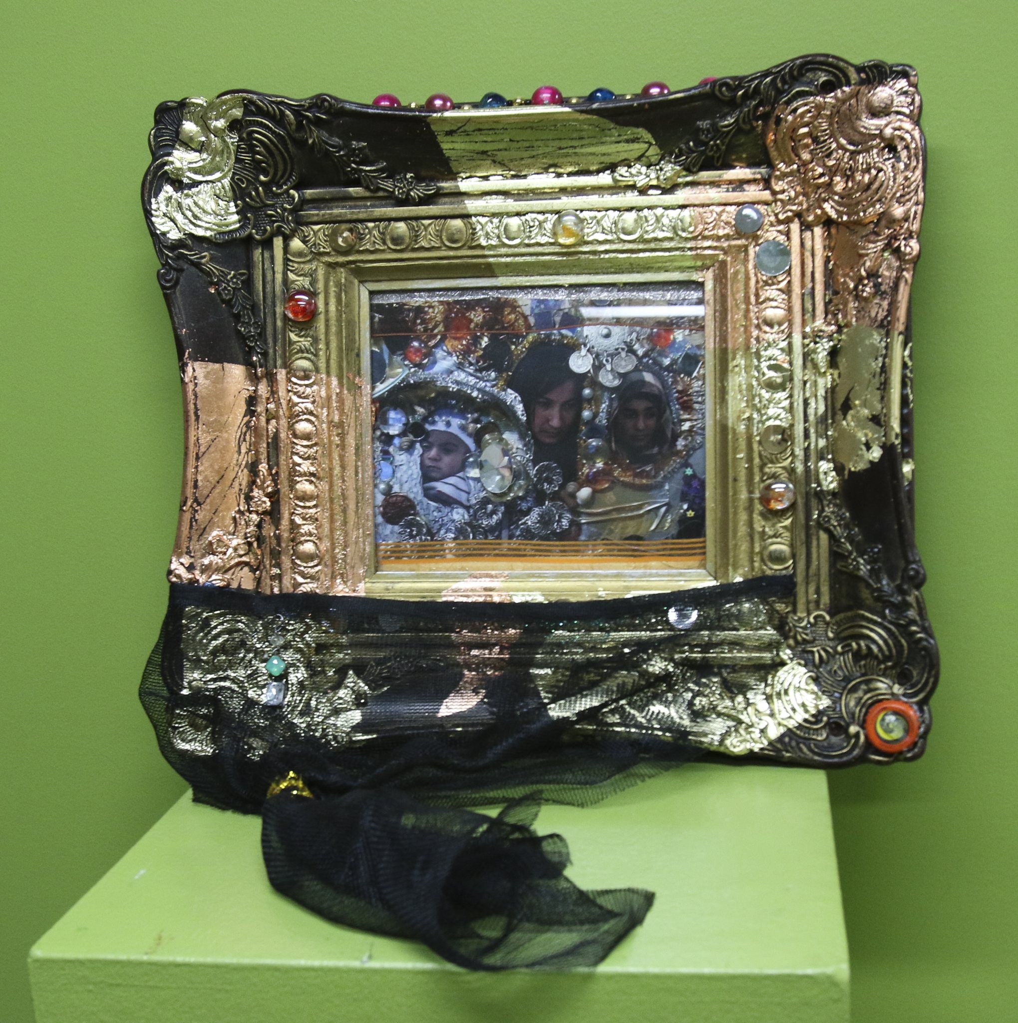 The pictures show photos of refugees that Hereth copied and embellished with costume jewelry, buttons, metallic candy wrappers and other found objects, then covered with gold and silver leaf. The gold and silver frames that hold the pictures are thrift store finds.
