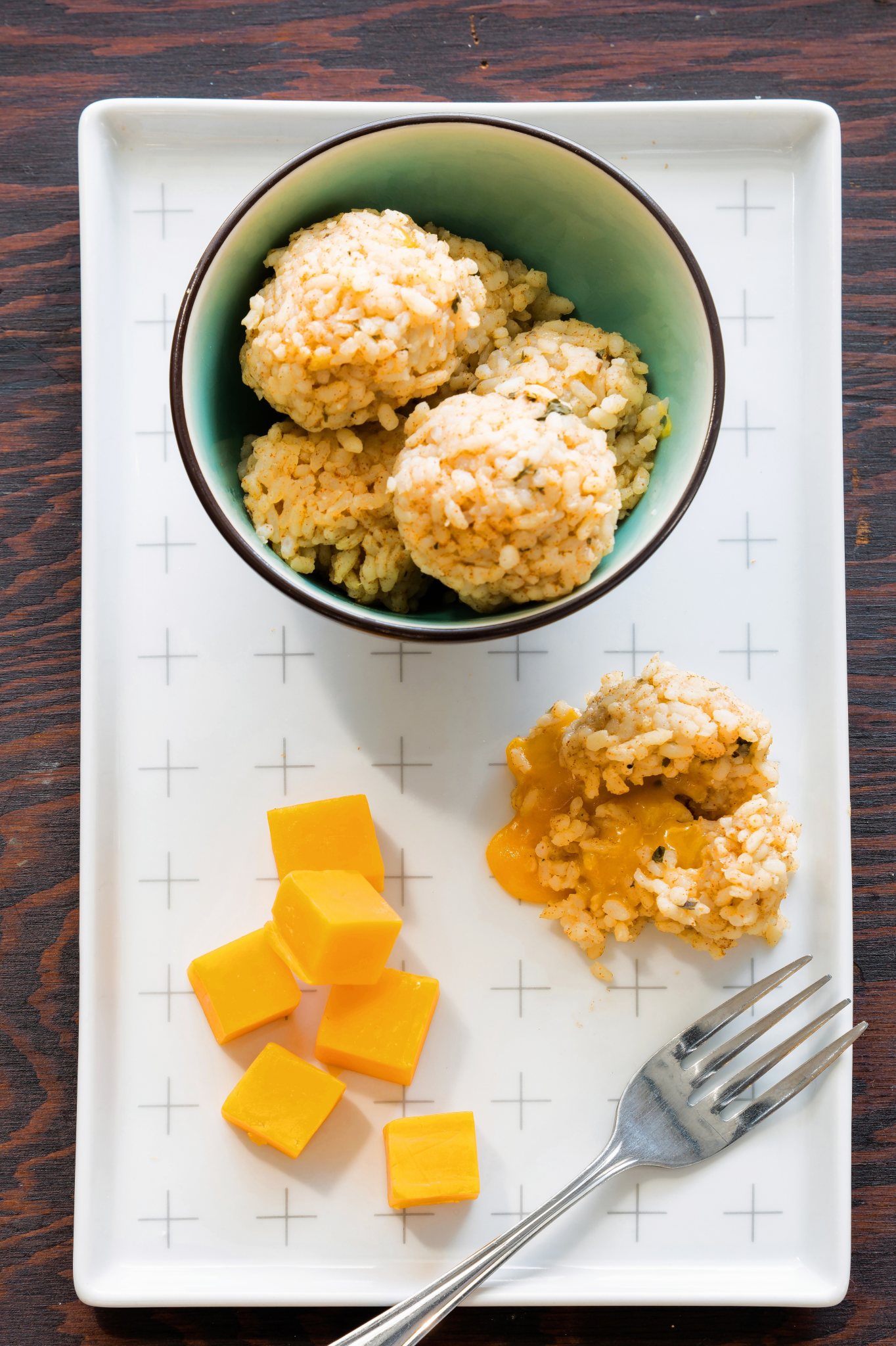 Use cool water to moisten your hands; use them to shape the mixture into 22 balls of equal size. Place a cheese cube at the center of each one, making sure it’s completely covered. (If you’re making these in advance, you can transfer them to an airtight container at this point.)
