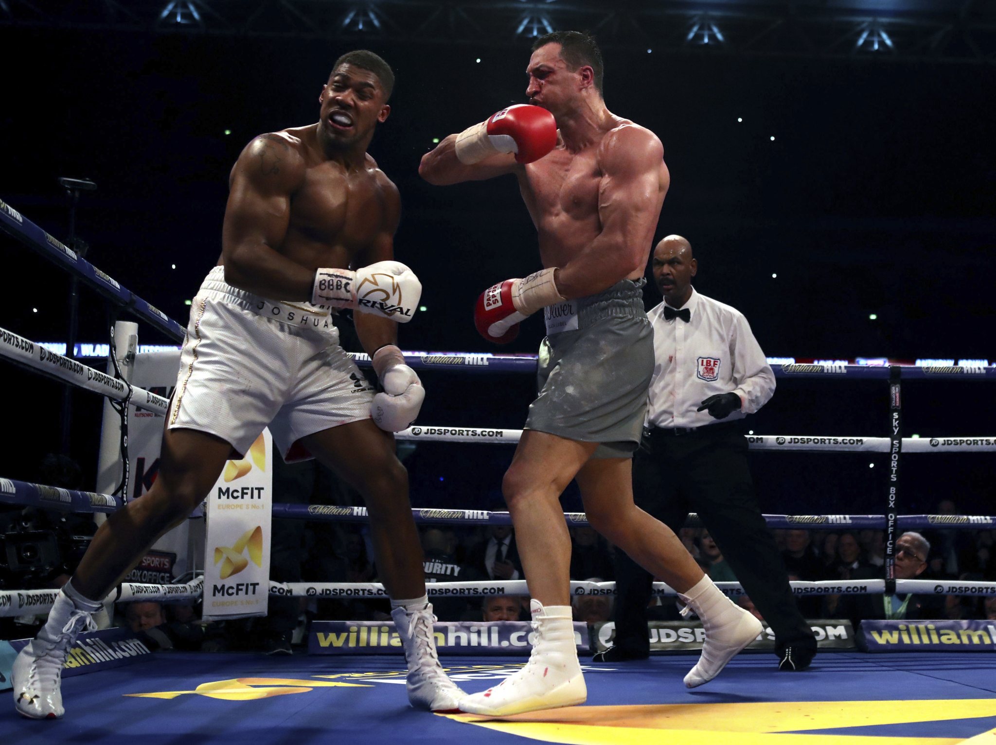 British boxer Anthony Joshua, left, takes a blow from Ukrainian boxer Wladimir Klitschko during their fight for Joshua's IBF and the vacant WBA Super World and IBO heavyweight titles, at Wembley Stadium, in London, Saturday, April 29, 2017. (Nick Potts/PA via AP)(/PA via AP)