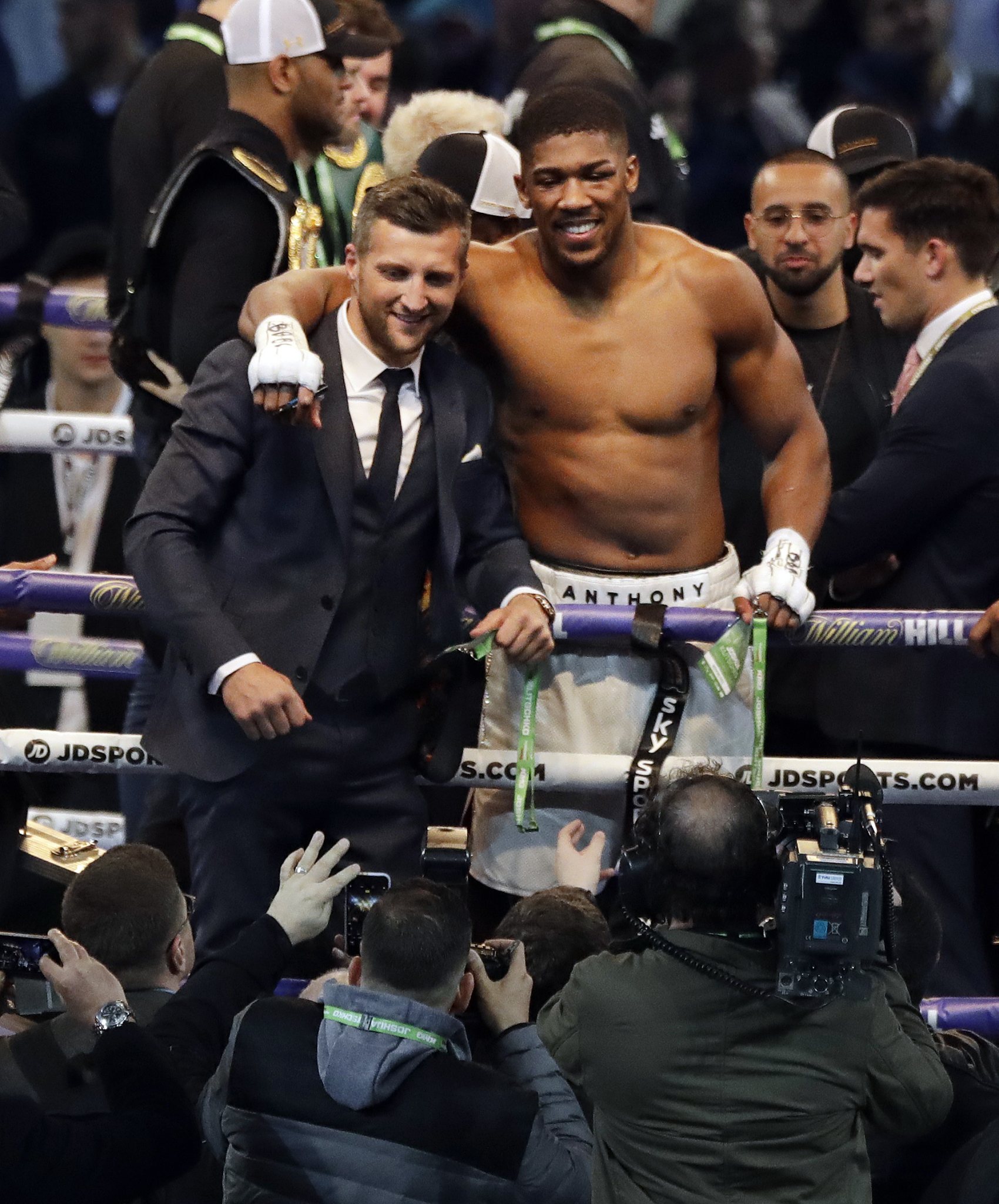 British boxer Anthony Joshua, right, smiles as he stands with former boxer Carl Froch after beating Ukrainian boxer Wladimir Klitschko in a fight for Joshua's IBF and the vacant WBA Super World and IBO heavyweight titles at Wembley stadium in London, Saturday, April 29, 2017. Joshua won with an 11th round stoppage. (AP Photo/Matt Dunham)