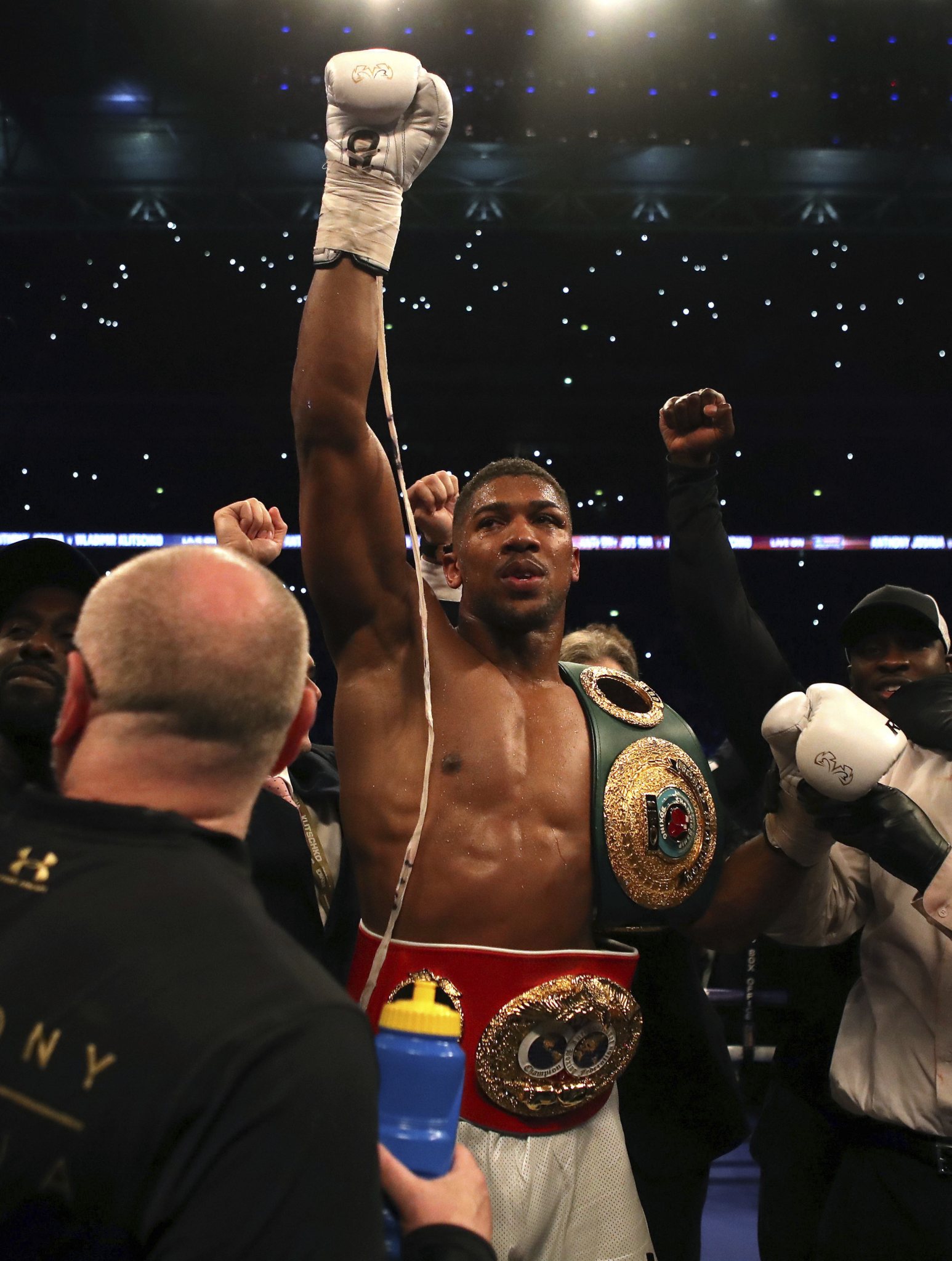 British boxer Anthony Joshua, centre, celebrates winning against Ukrainian boxer Wladimir Klitschko following their fight for Joshua's IBF and the vacant WBA Super World and IBO heavyweight titles, at Wembley Stadium, in London, Saturday, April 29, 2017. (Nick Potts/PA via AP)