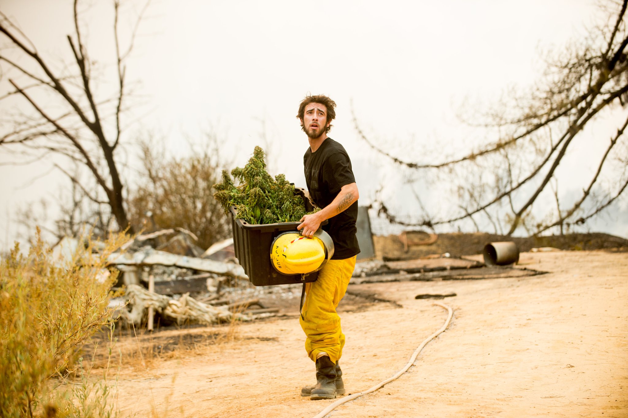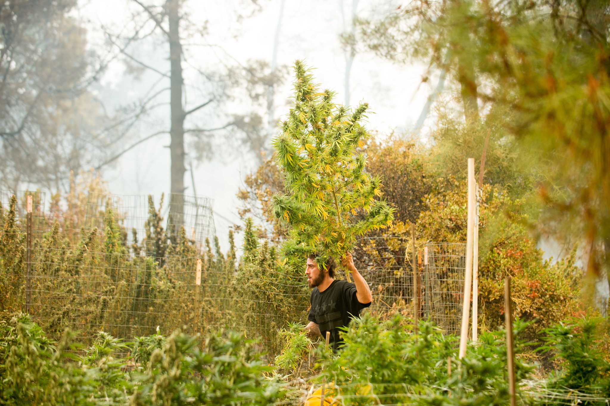 Anthony Lopez harvests marijuana plants as the Loma fire burns around his home near Morgan Hill, Calif., on Tuesday, Sept. 27, 2016. (AP Photo/Noah Berger)