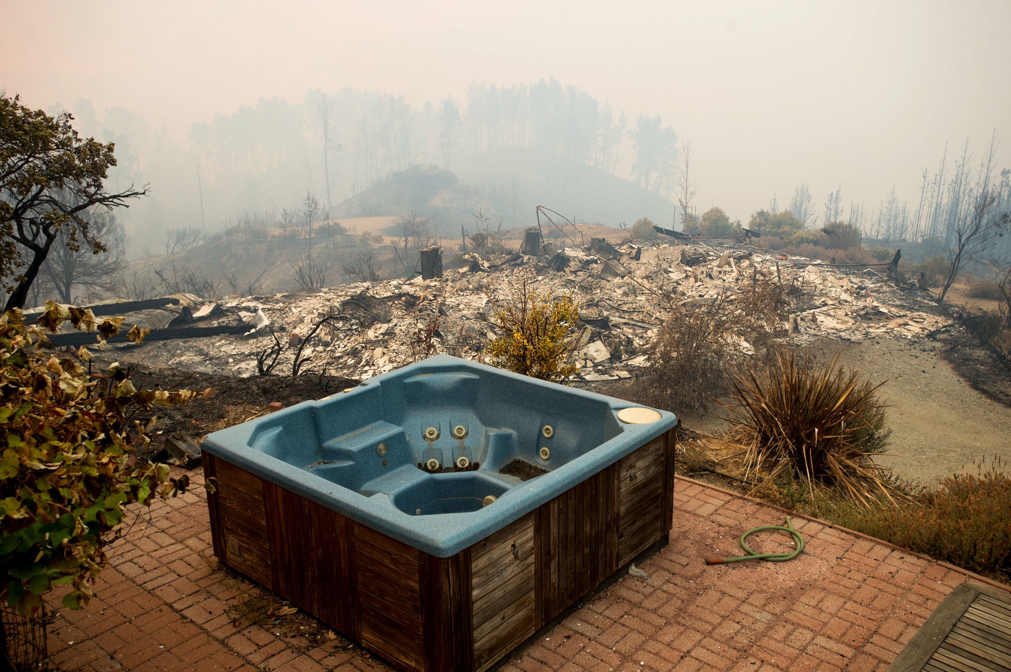 A hot tub rests in front of a residence leveled by the Loma fire along Loma Chiquita Road on Tuesday, Sept. 27, 2016, near Morgan Hill, Calif. More California residents were ordered from their homes Tuesday as a growing wildfire threatened remote communities in the Santa Cruz Mountains. (AP Photo/Noah Berger)