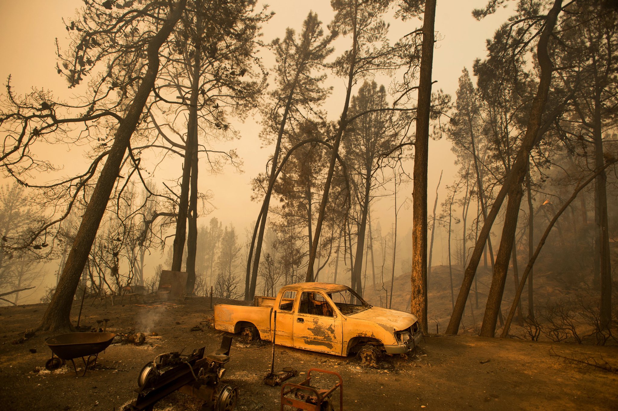 A burned-out truck rests in a clearing after the Loma fire tore along a ridge top near Morgan Hill, Calif., on Tuesday, Sept. 27, 2016. More California residents were ordered from their homes Tuesday as a growing wildfire threatened remote communities in the Santa Cruz Mountains. (AP Photo/Noah Berger)