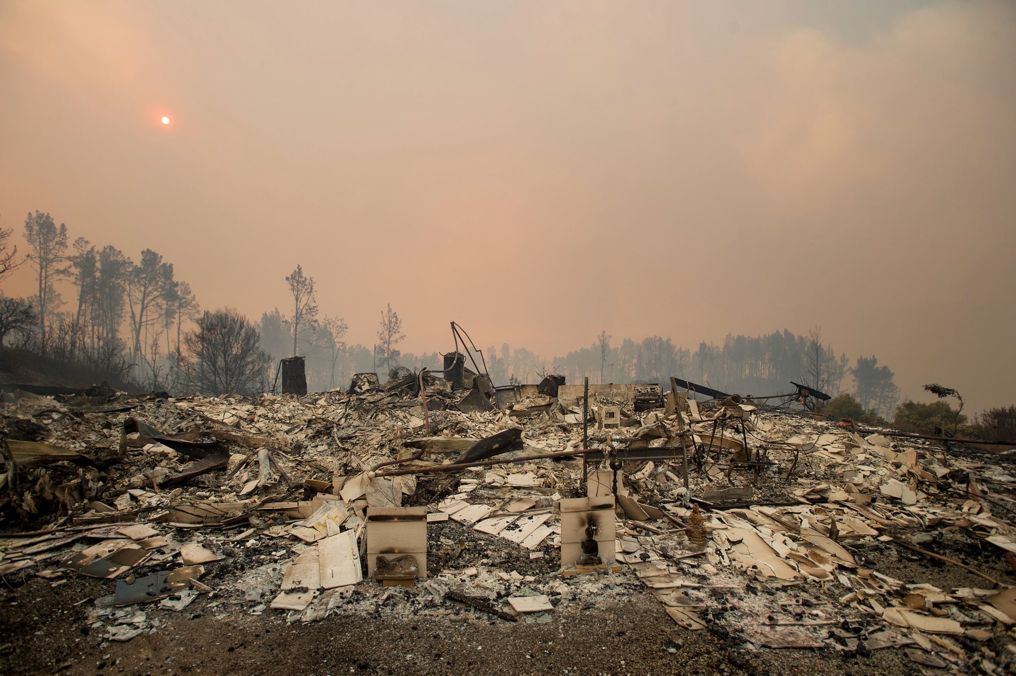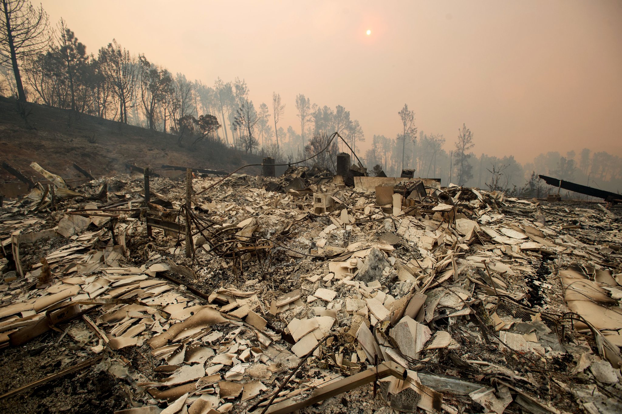 Rubble lines a residence leveled by the Loma fire along Loma Chiquita Road on Tuesday, Sept. 27, 2016, near Morgan Hill, Calif. More California residents were ordered from their homes Tuesday as a growing wildfire threatened remote communities in the Santa Cruz Mountains. (AP Photo/Noah Berger)