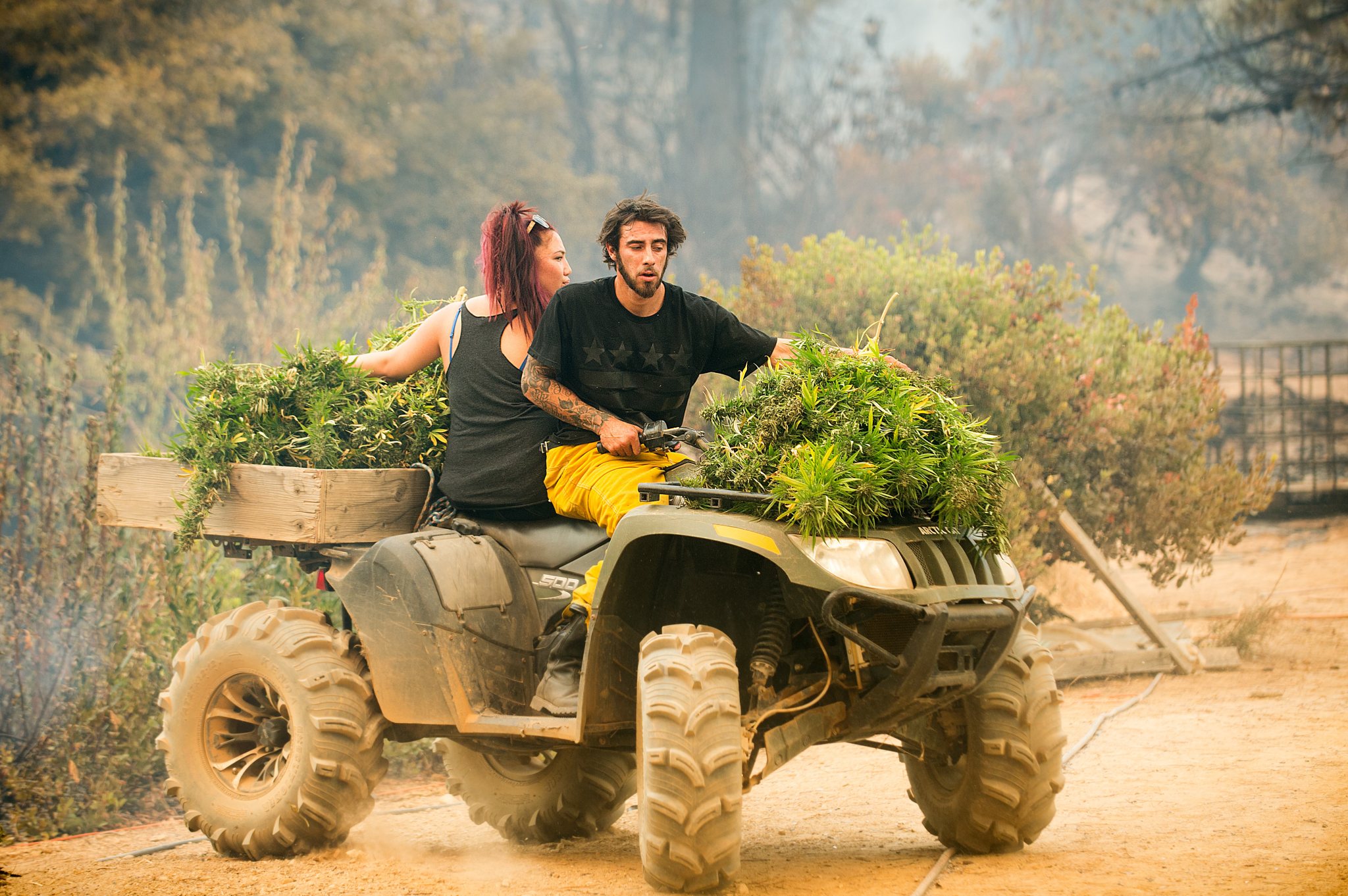 Anthony Lopez, with his girlfriend Sarah Torres, harvests marijuana plants as the Loma fire burns around his home near Morgan Hill, Calif., on Tuesday, Sept. 27, 2016. (AP Photo/Noah Berger)