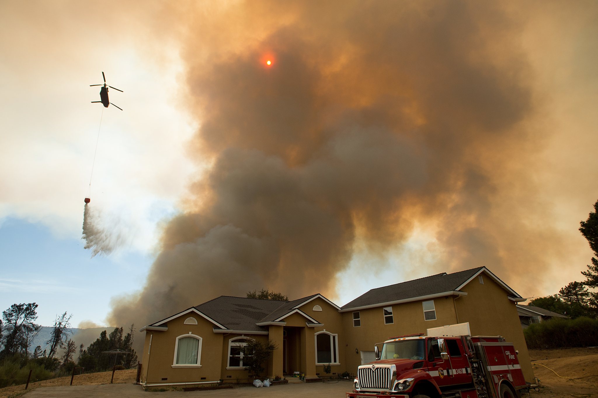 A helicopter drops water as the Loma fire approaches a home near Morgan Hill, Calif., on Tuesday, Sept. 27, 2016. (AP Photo/Noah Berger)