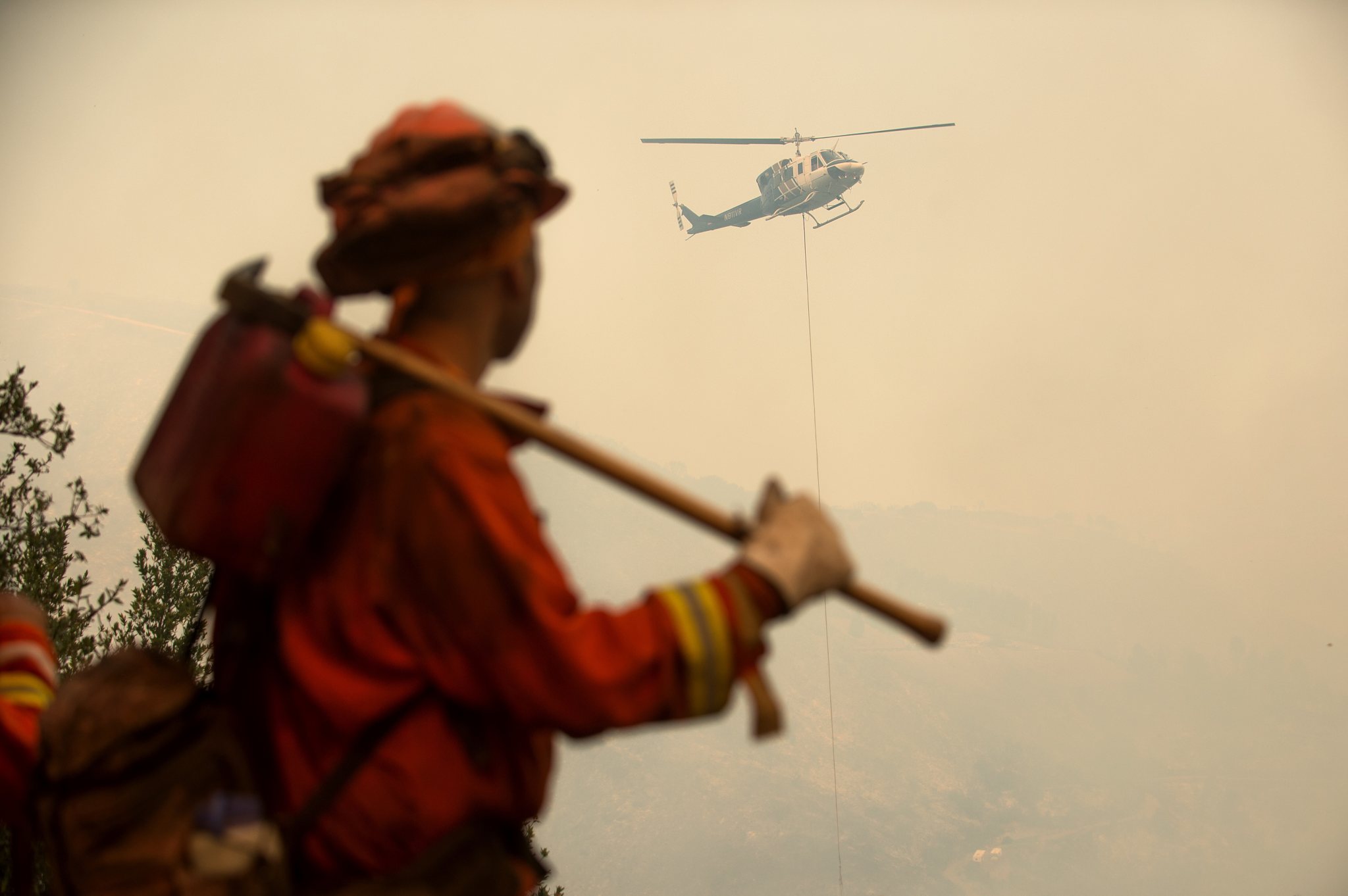 An inmate firefighter watches a helicopter drop water on the Loma fire burning near Morgan Hill, Calif., on Tuesday, Sept. 27, 2016. (AP Photo/Noah Berger)