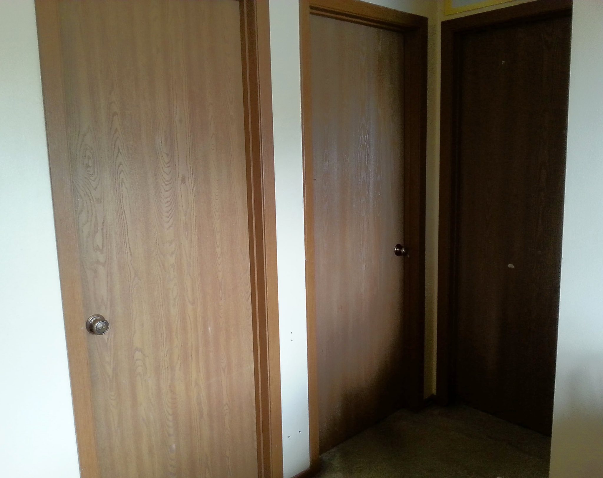 Many homes have dark, ugly, flat-panel doors and the Flesh home in Aurora is no exception. Their home has dark Jacobean brown plastic doors that were installed during the home’s original construction in 1989. These brown doors darken the entire hallway leading to the bedrooms and cleaning them over the years has caused them to fade and wear down.