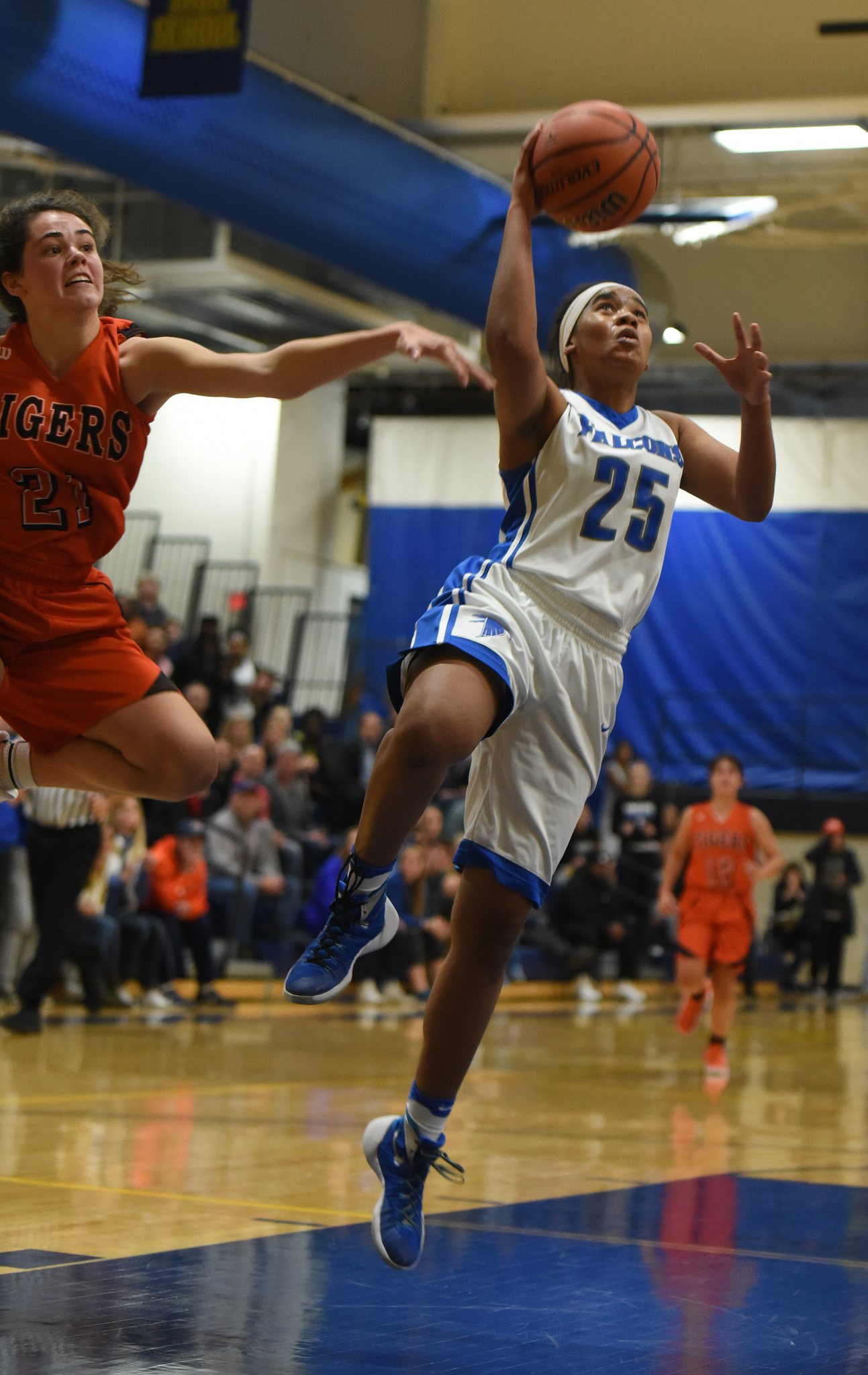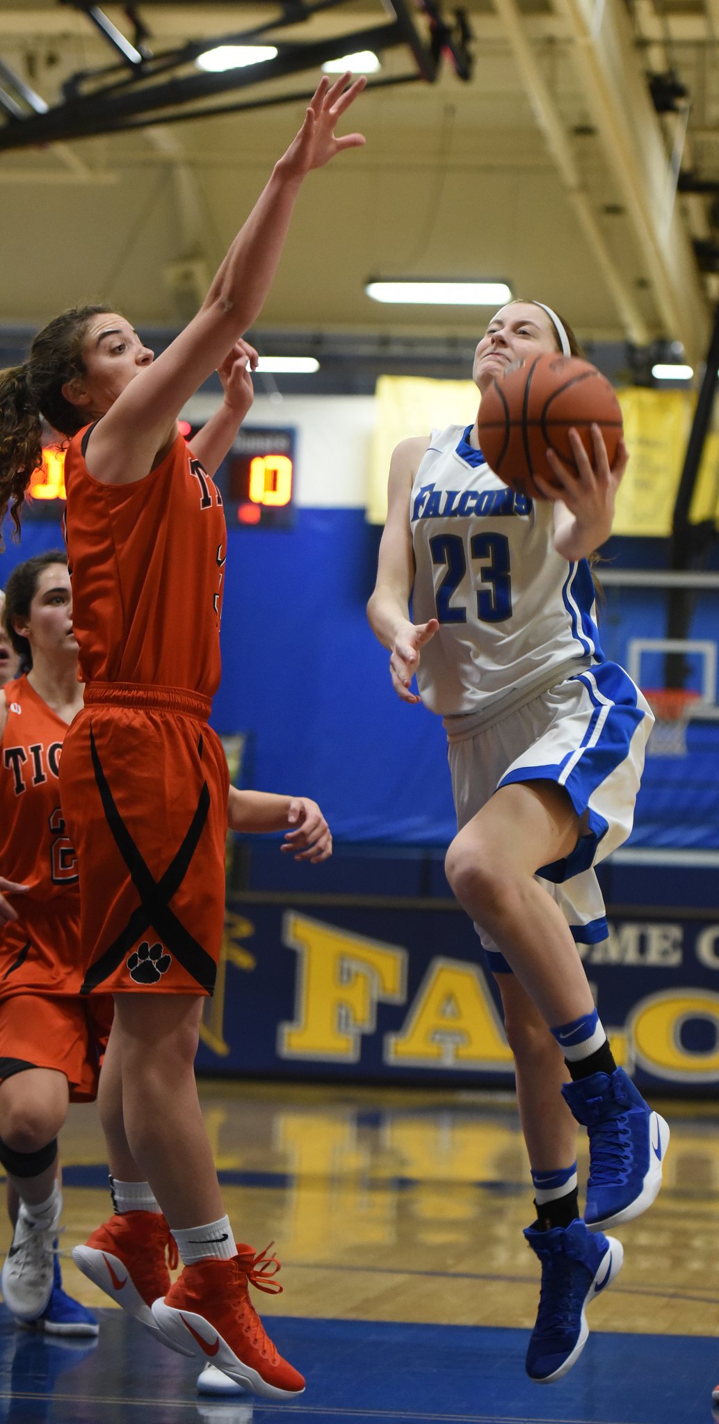 One of Swider’s four 3-pointers gave the Falcons their biggest lead of the game, 38-25 with 5:45 to play. The Tigers narrowed the lead with free throws and a last-second Mira Emma 3-pointer.