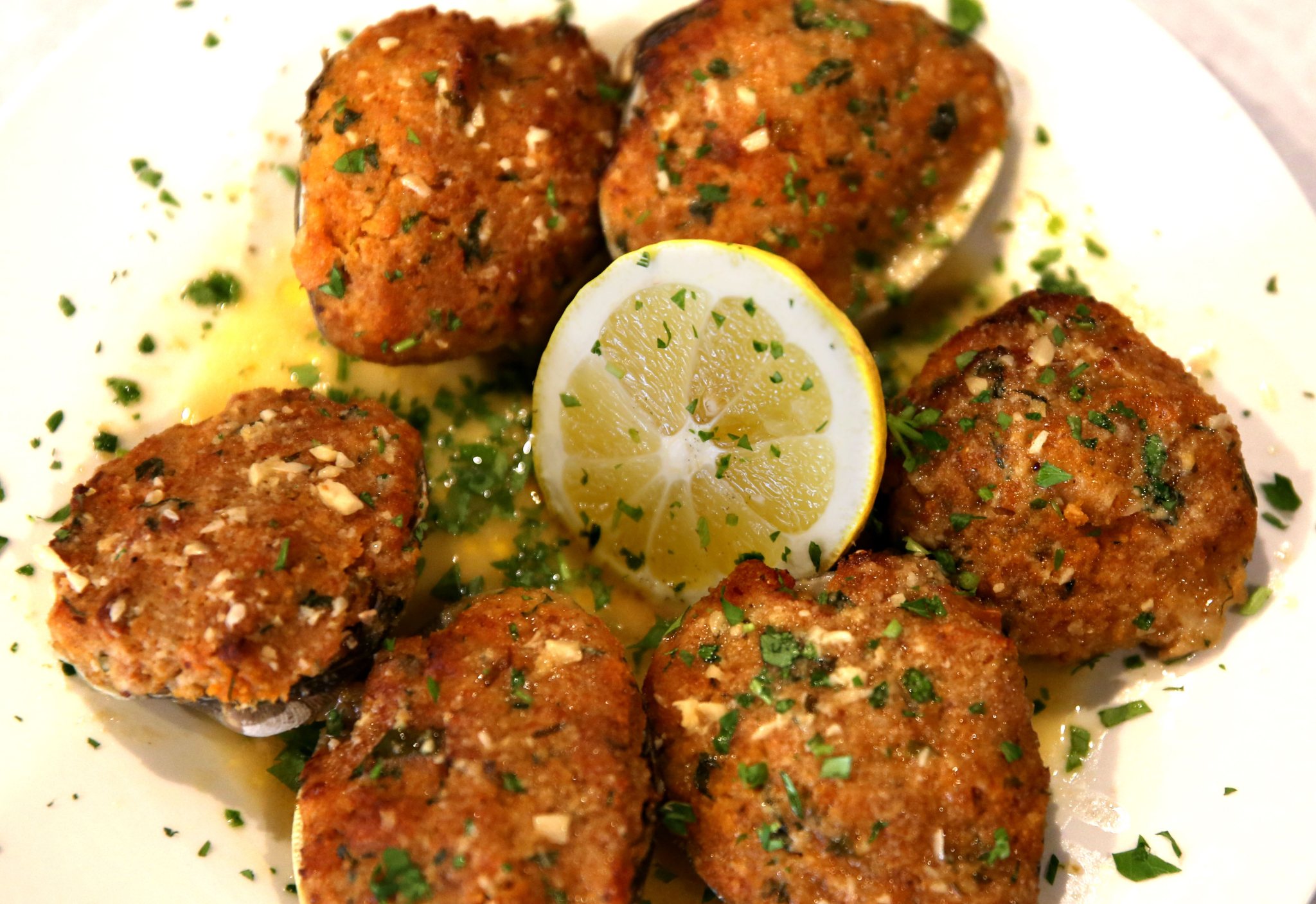 Among starter options are baked clams, fresh homemade fried mozzarella, and sweet Italian sausage and peppers.