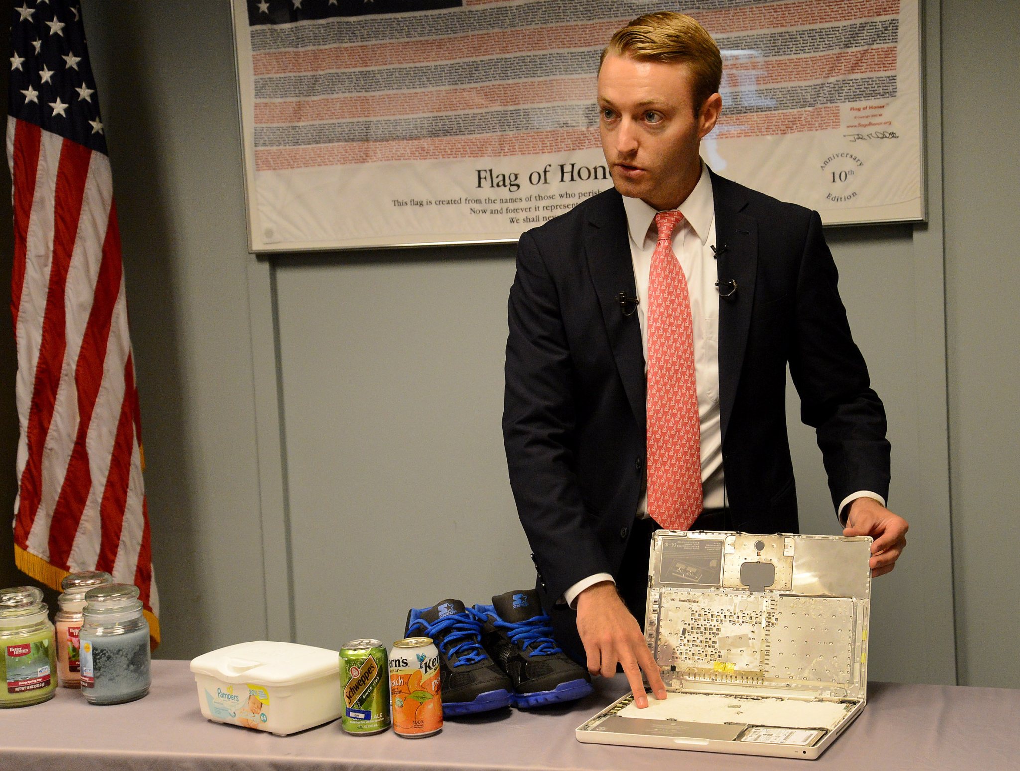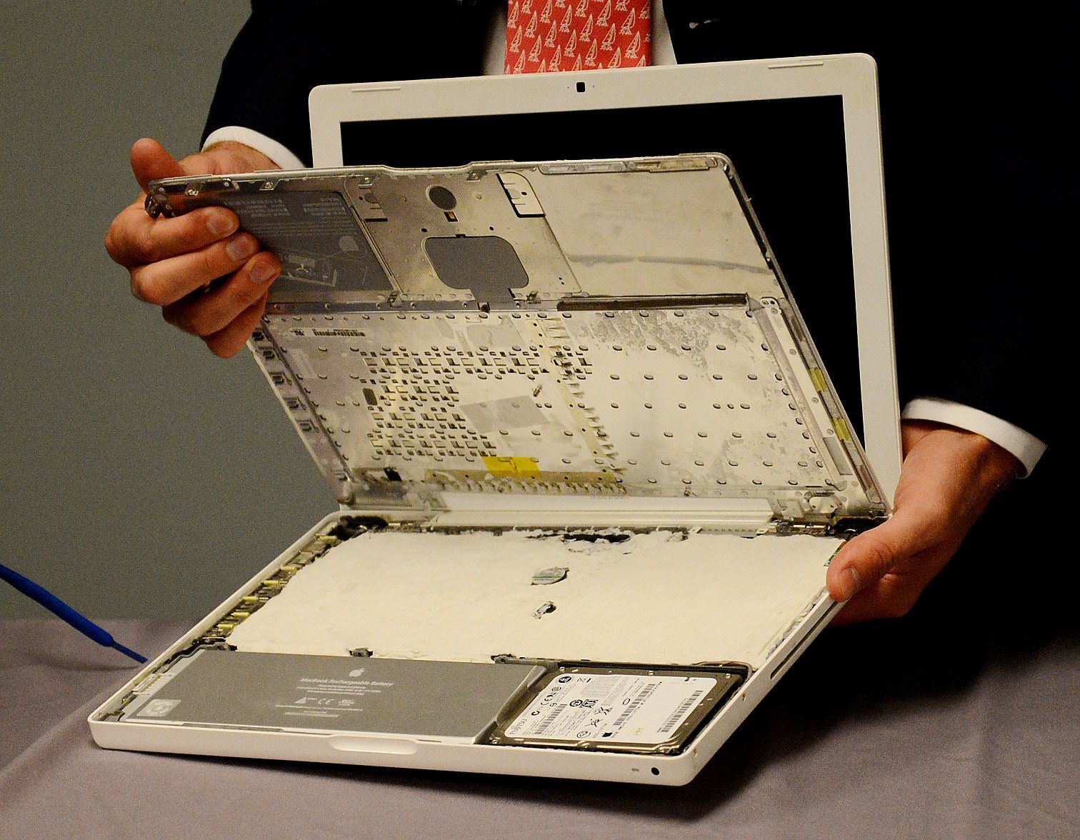 “This looks like an ordinary laptop,” TSA spokesman Michael McCarthy said, gesturing at a computer and sounding like a magician. “But it’s been altered. When you lift it up you can see there’s a mock explosive placed inside.”