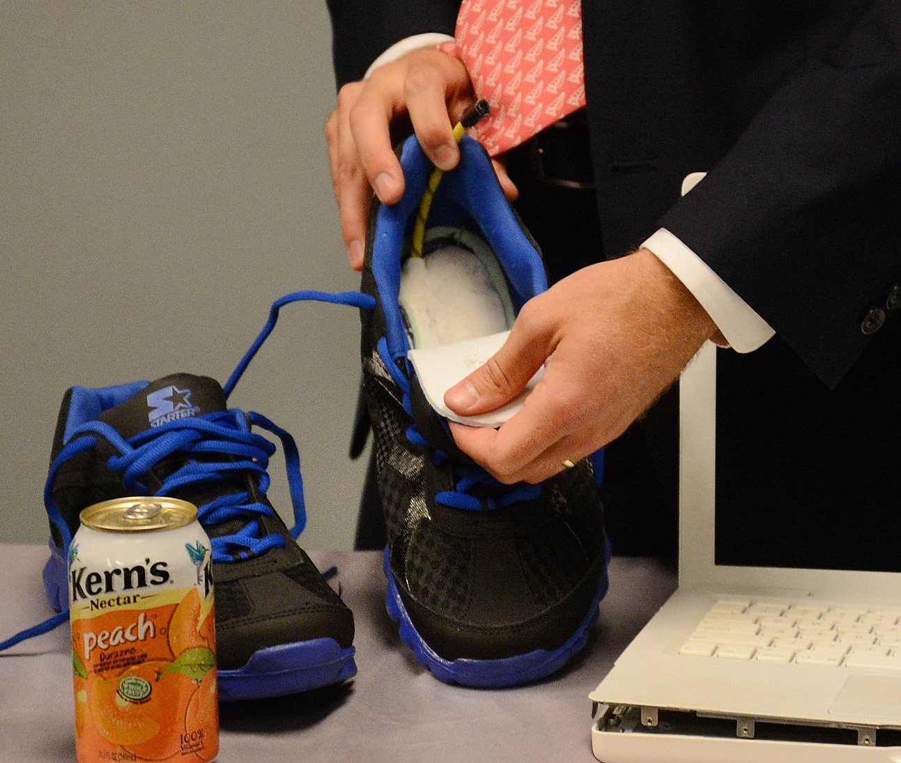 “These look like everyday shoes, but they feel a little bit heavier,” McCarthy said, indicating a pair of sneakers. “That’s because if you peel back the tongue there’s a mock explosive inside there and here’s the ignition.”