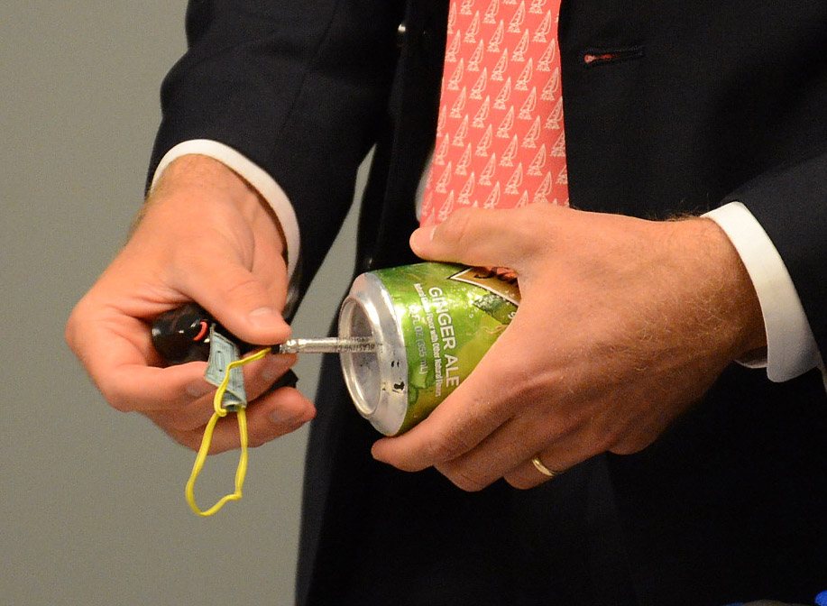 But I can’t complain after McCarthy showed off a doctored soda can hollowed out at the bottom to fit a blasting cap, a small explosive device that triggers a more powerful one.