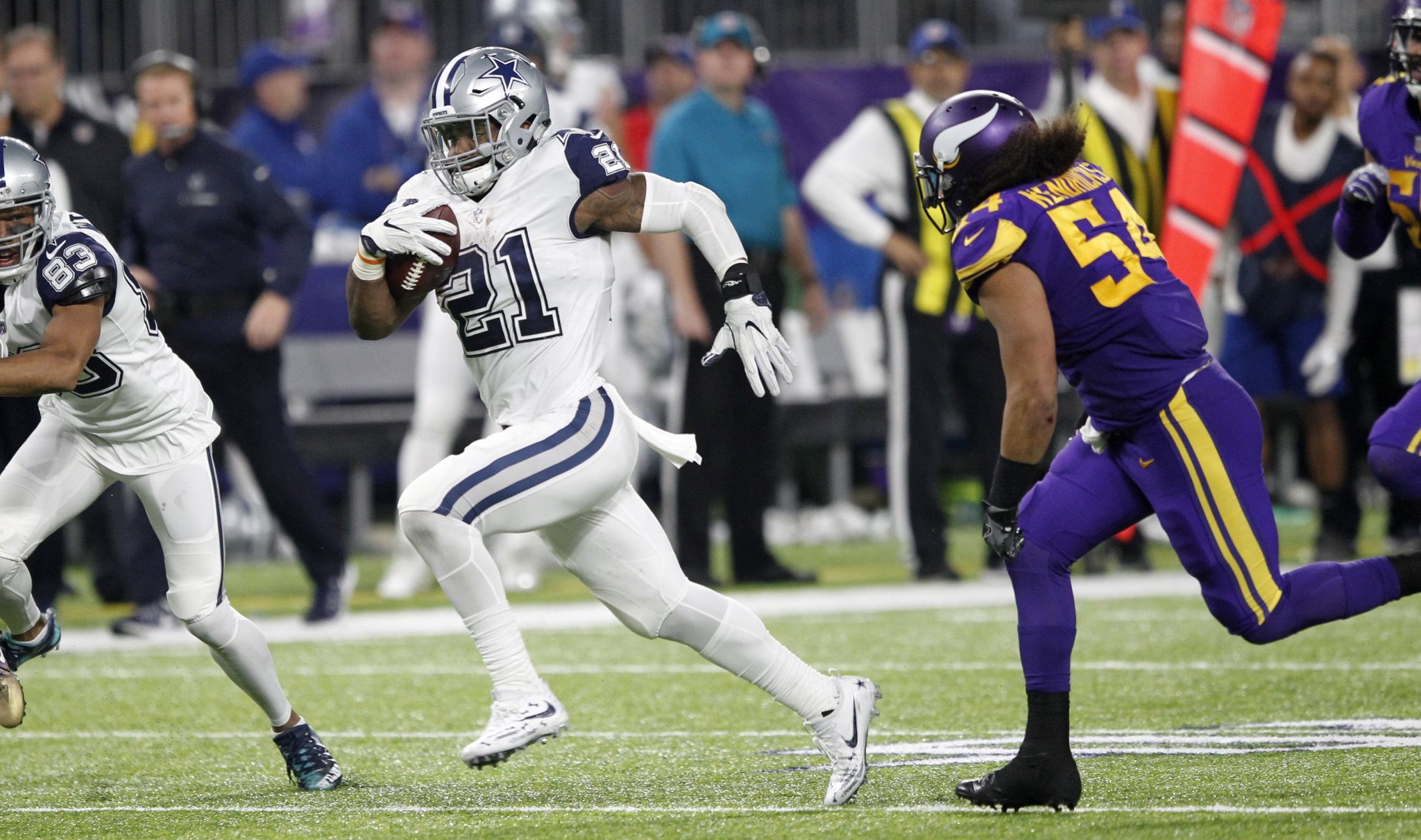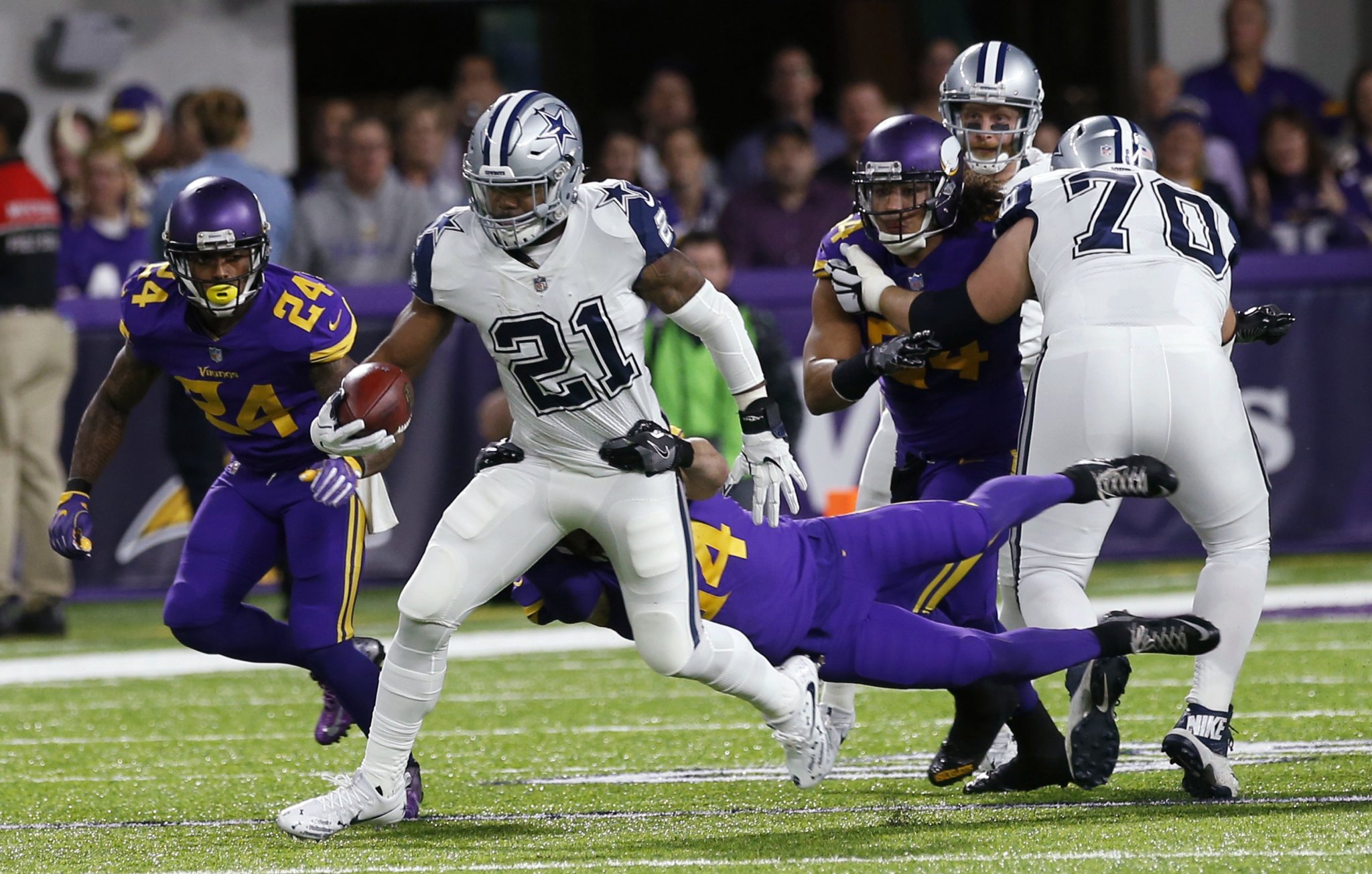 Dallas Cowboys running back Ezekiel Elliott (21) runs from Minnesota Vikings middle linebacker Eric Kendricks, right, during the second half of an NFL football game Thursday, Dec. 1, 2016, in Minneapolis. (AP Photo/Andy Clayton-King)