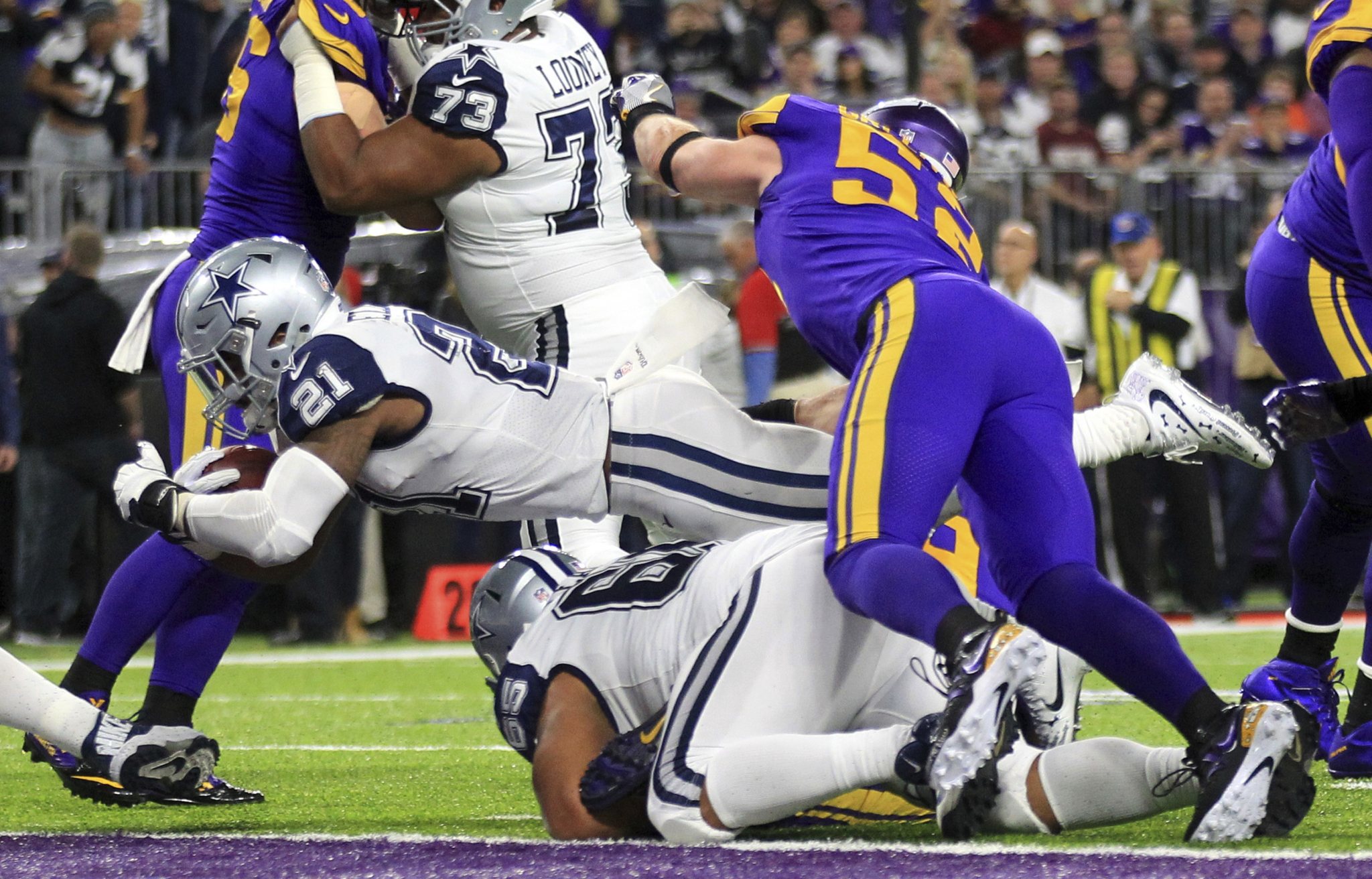 Dallas Cowboys running back Ezekiel Elliott (21) scores on a 1-yard touchdown run in front of Minnesota Vikings outside linebacker Chad Greenway (52) during the first half of an NFL football game Thursday, Dec. 1, 2016, in Minneapolis. (AP Photo/Andy Clayton-King)