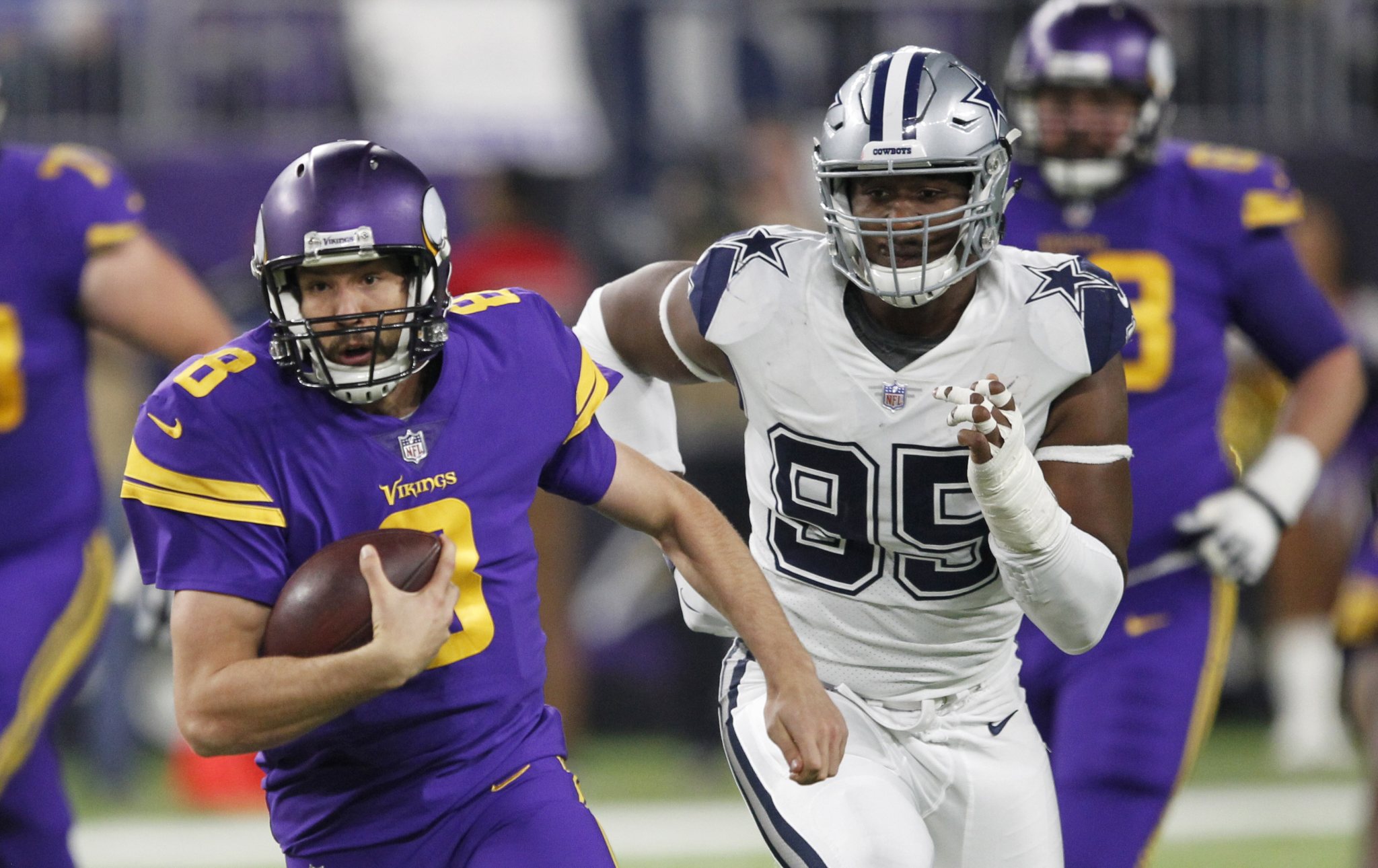 Minnesota Vikings quarterback Sam Bradford runs from Dallas Cowboys defensive tackle David Irving, right, during the second half of an NFL football game Thursday, Dec. 1, 2016, in Minneapolis. (AP Photo/Andy Clayton-King)
