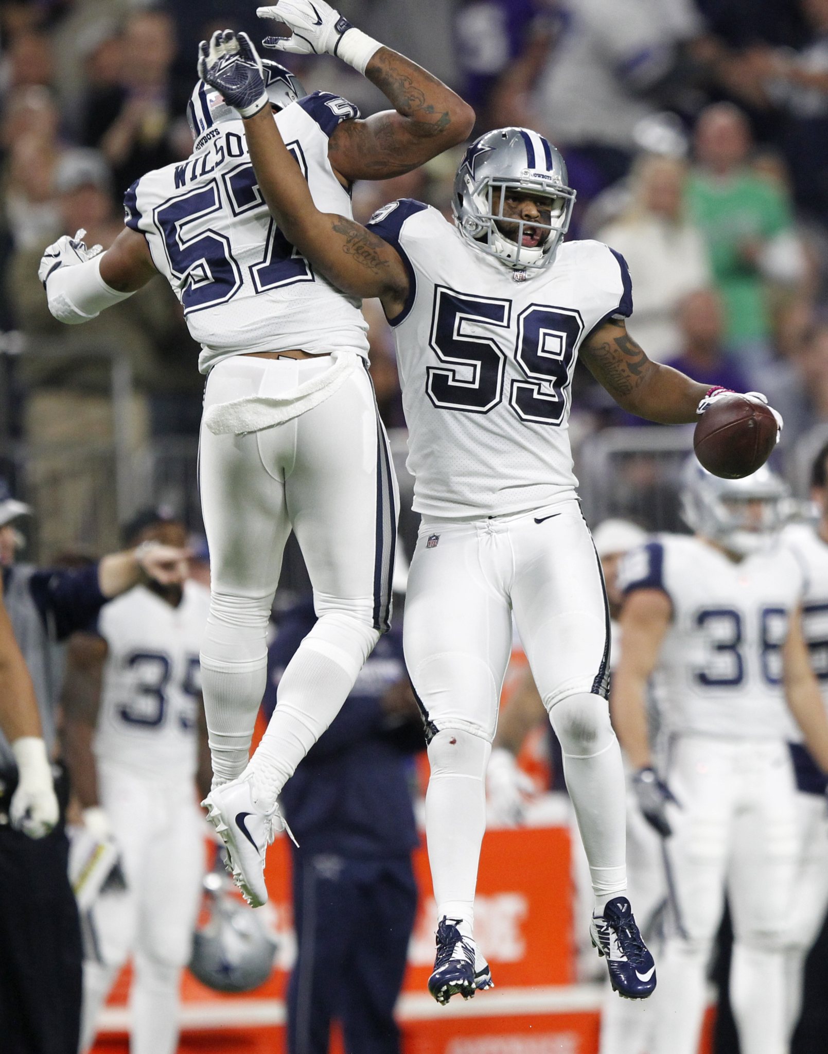 Dallas Cowboys middle linebacker Anthony Hitchens, right, celebrates with Damien Wilson during the first half of an NFL football game against the Minnesota Vikings on Thursday, Dec. 1, 2016, in Minneapolis. Hitchens intercepted a pass, but the play was negated by a penalty. (AP Photo/Andy Clayton-King)