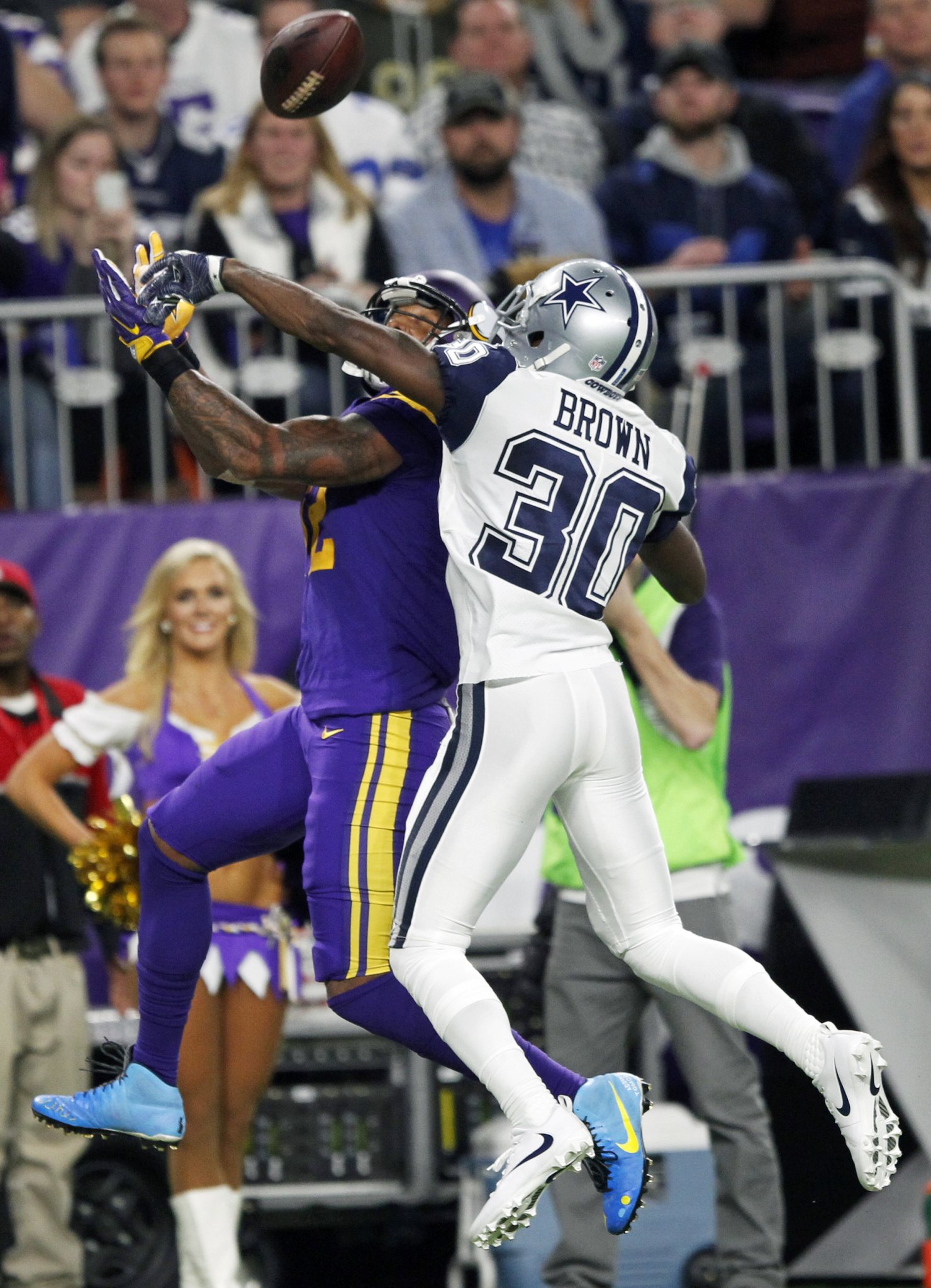 Dallas Cowboys cornerback Anthony Brown, right, breaks up a pass intended for Minnesota Vikings wide receiver Charles Johnson during the second half of an NFL football game Thursday, Dec. 1, 2016, in Minneapolis. (AP Photo/Andy Clayton-King)