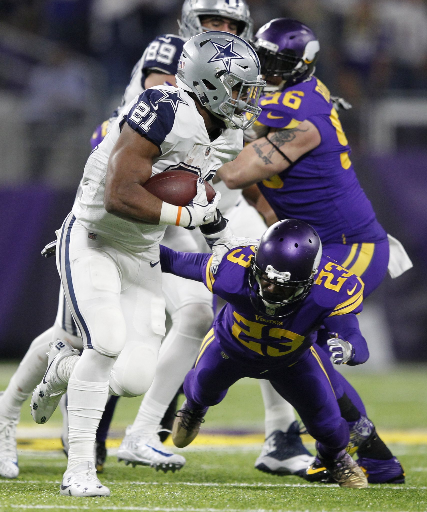 Dallas Cowboys running back Ezekiel Elliott (21) tries to break a tackle by Minnesota Vikings strong safety Andrew Sendejo during the first half of an NFL football game Thursday, Dec. 1, 2016, in Minneapolis. (AP Photo/Jim Mone)