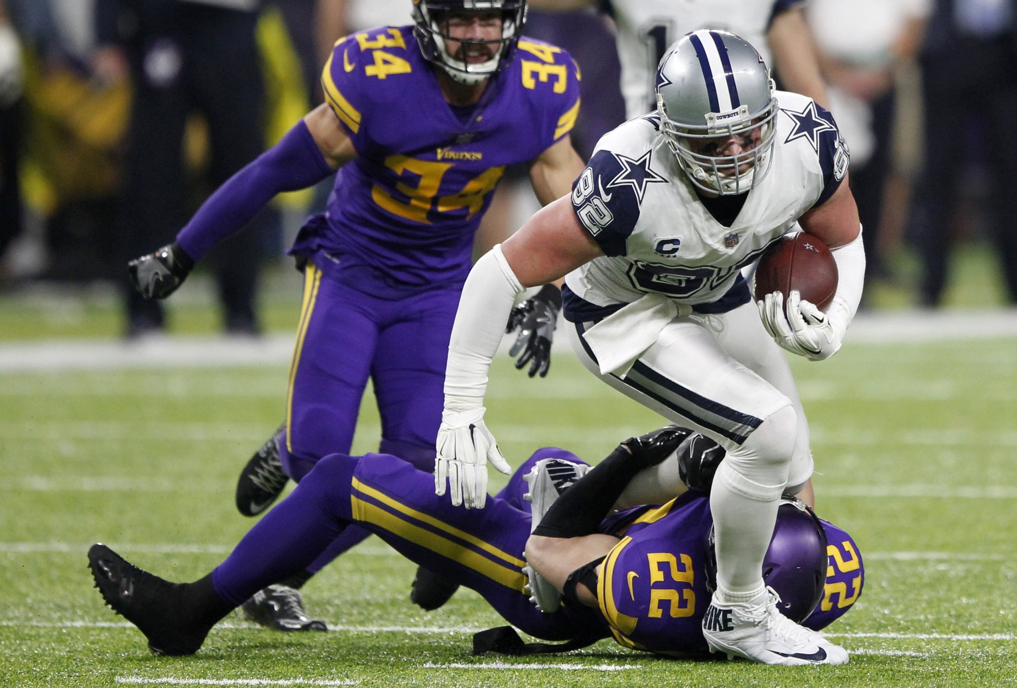 Dallas Cowboys tight end Jason Witten (82) is tackled by Minnesota Vikings free safety Harrison Smith (22) after making a reception during the second half of an NFL football game Thursday, Dec. 1, 2016, in Minneapolis. (AP Photo/Andy Clayton-King)