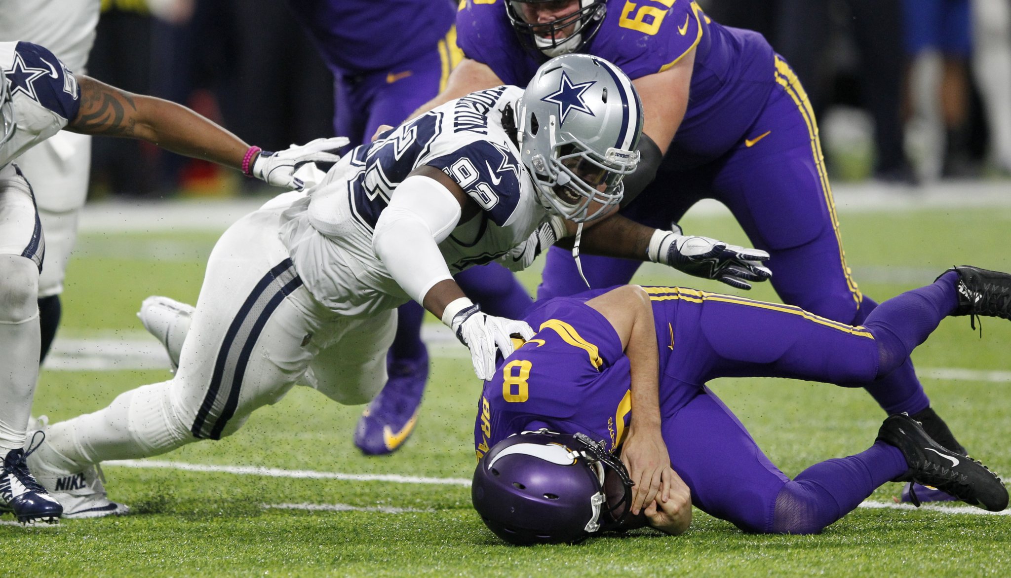 Dallas Cowboys defensive tackle Cedric Thornton, left, sacks Minnesota Vikings quarterback Sam Bradford (8) during the second half of an NFL football game Thursday, Dec. 1, 2016, in Minneapolis. (AP Photo/Andy Clayton-King)