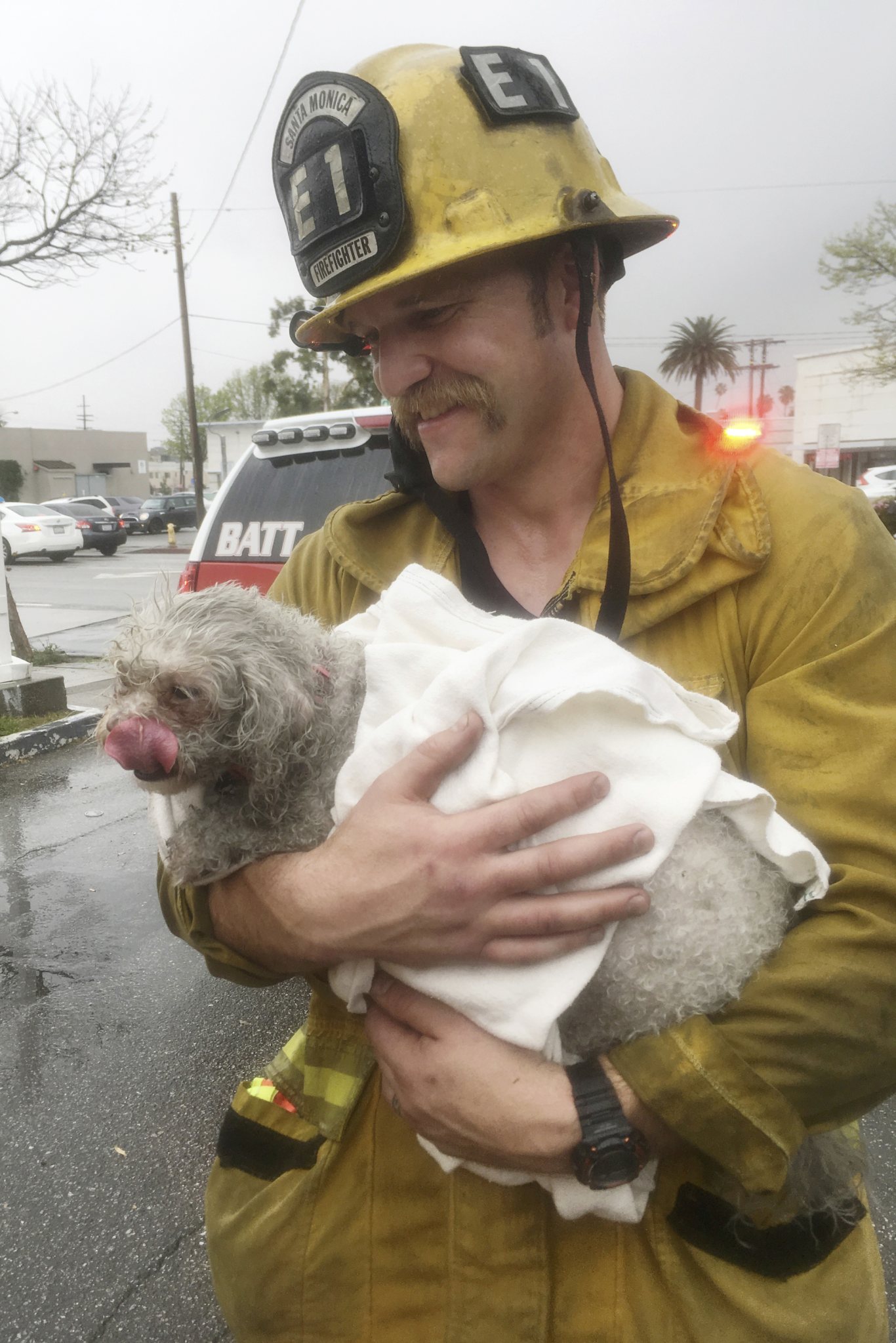 LOS ANGELES — Firefighters who spent 20 minutes performing mouth-to-snout resuscitation on a dog they rescued from a burning apartment are being hailed as heroes. The dog’s owner, Crystal Lamirande, had just returned to her Santa Monica apartment when a neighbor yelled there was a fire. Lamirande frantically tried to save her dog, a 10-year-old Bichon Frise/Shih Tzu named Nalu, but the smoke was too thick, she said. That’s when firefighter Andrew Klein sprang into action, getting on all fours to search the apartment. “He was totally lifeless,” Klein said. “I picked him up and ran out of the apartment because time is key, especially with a small dog. ... Failure was not an option.”