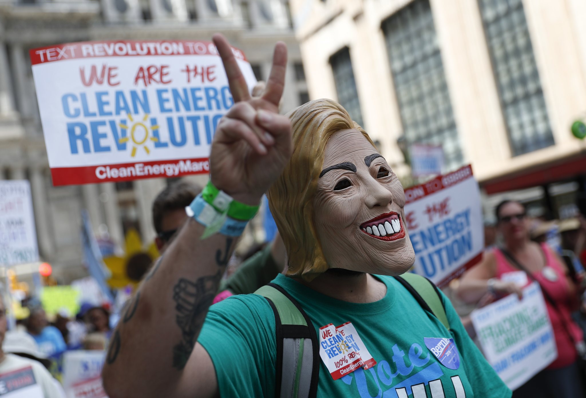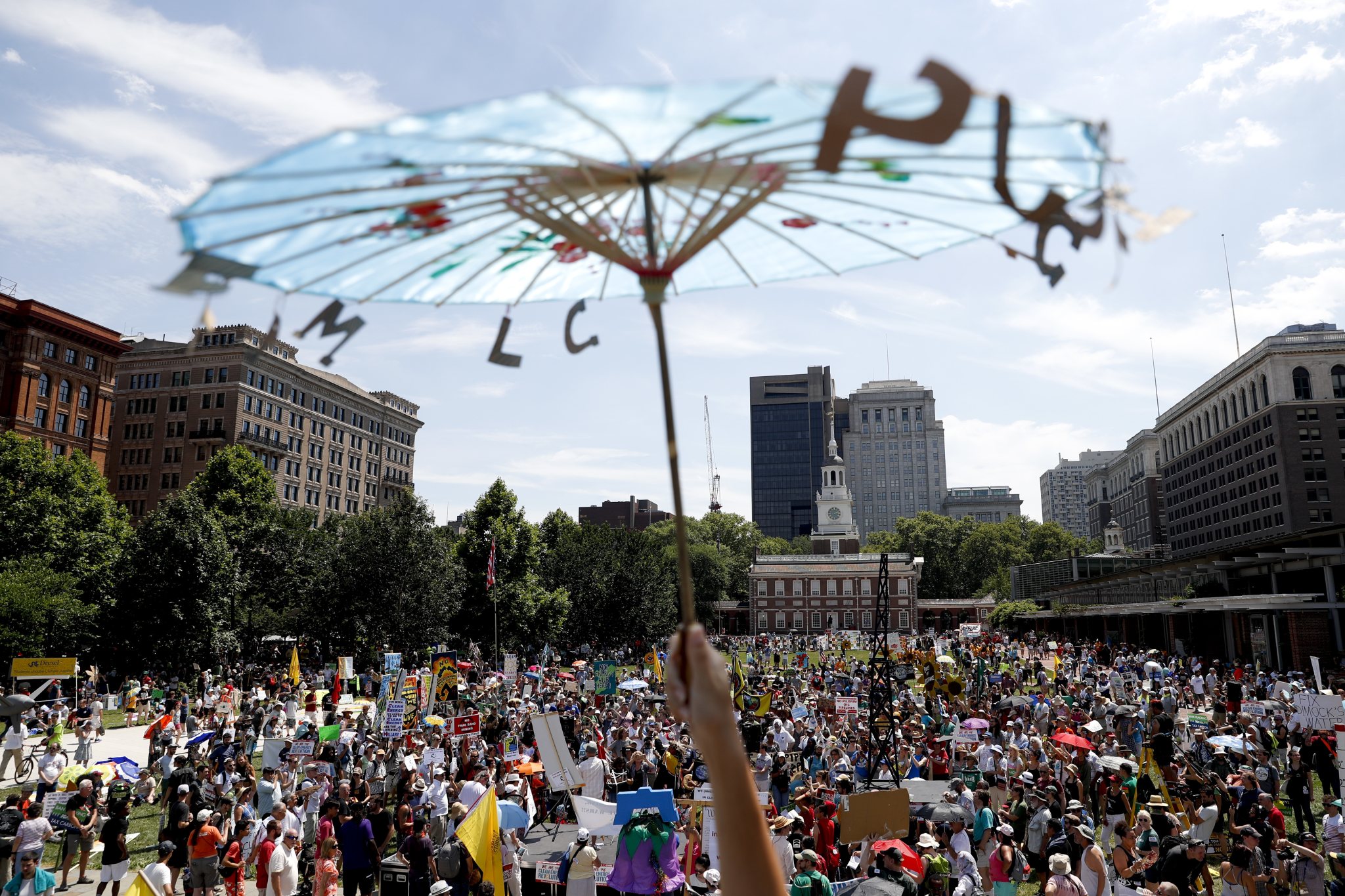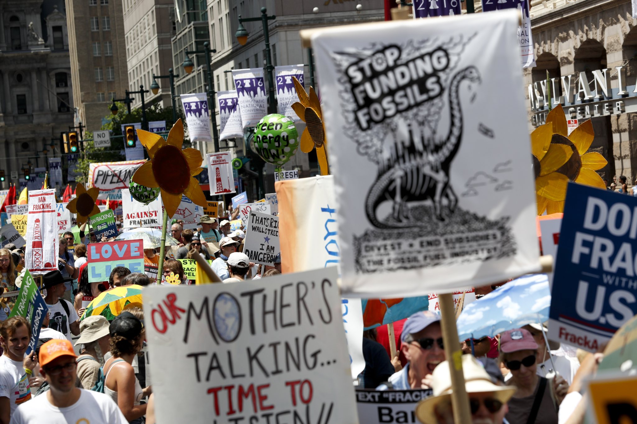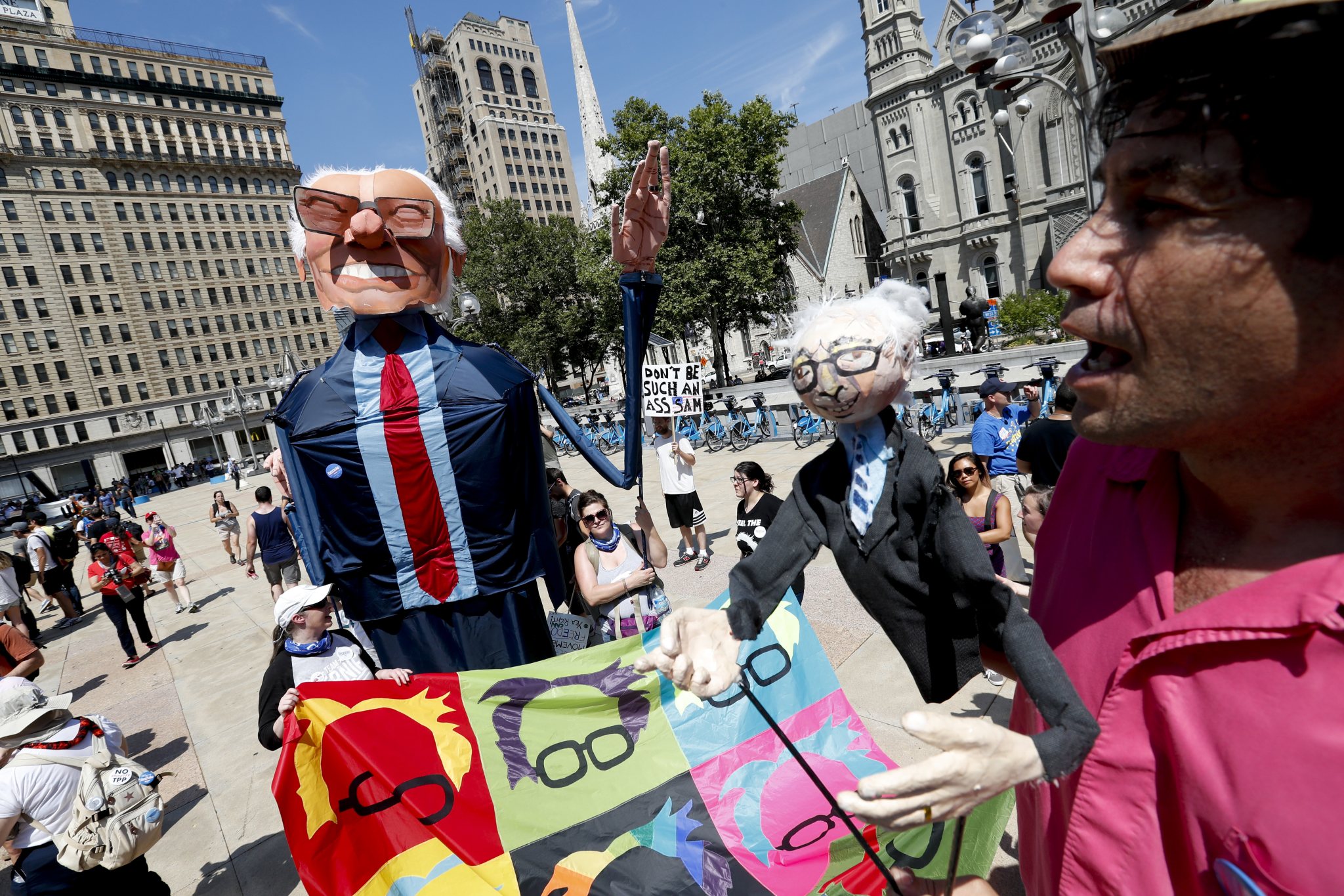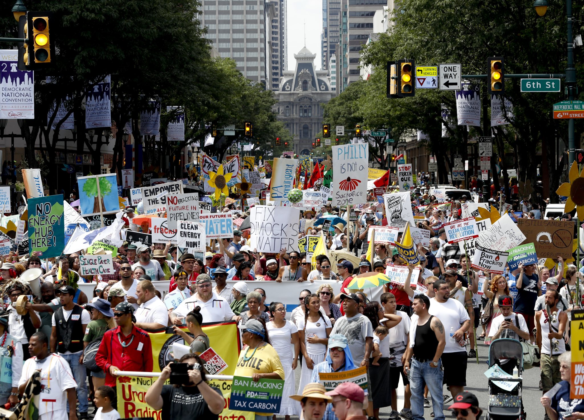 Earlier Sunday, thousands of clean energy activists jammed a downtown street in their milelong march from City Hall to Independence Hall, near the Liberty Bell. They held anti-fracking and anti-pipeline signs, some with illustrations like a train surrounded by a fireball and the words “No Exploding Trains.” Others held “Bernie or Bust” signs.