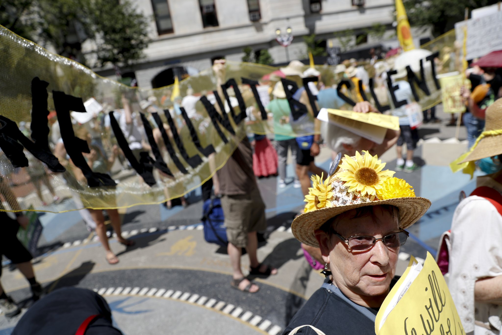 Sam Miller, 82, traveled from Erie, Pennsylvania, to join the march that stretched several blocks and across a wide street as temperatures in the city soared into the mid-90s. He said he was inspired because “fracking is invading Mother Earth.”
