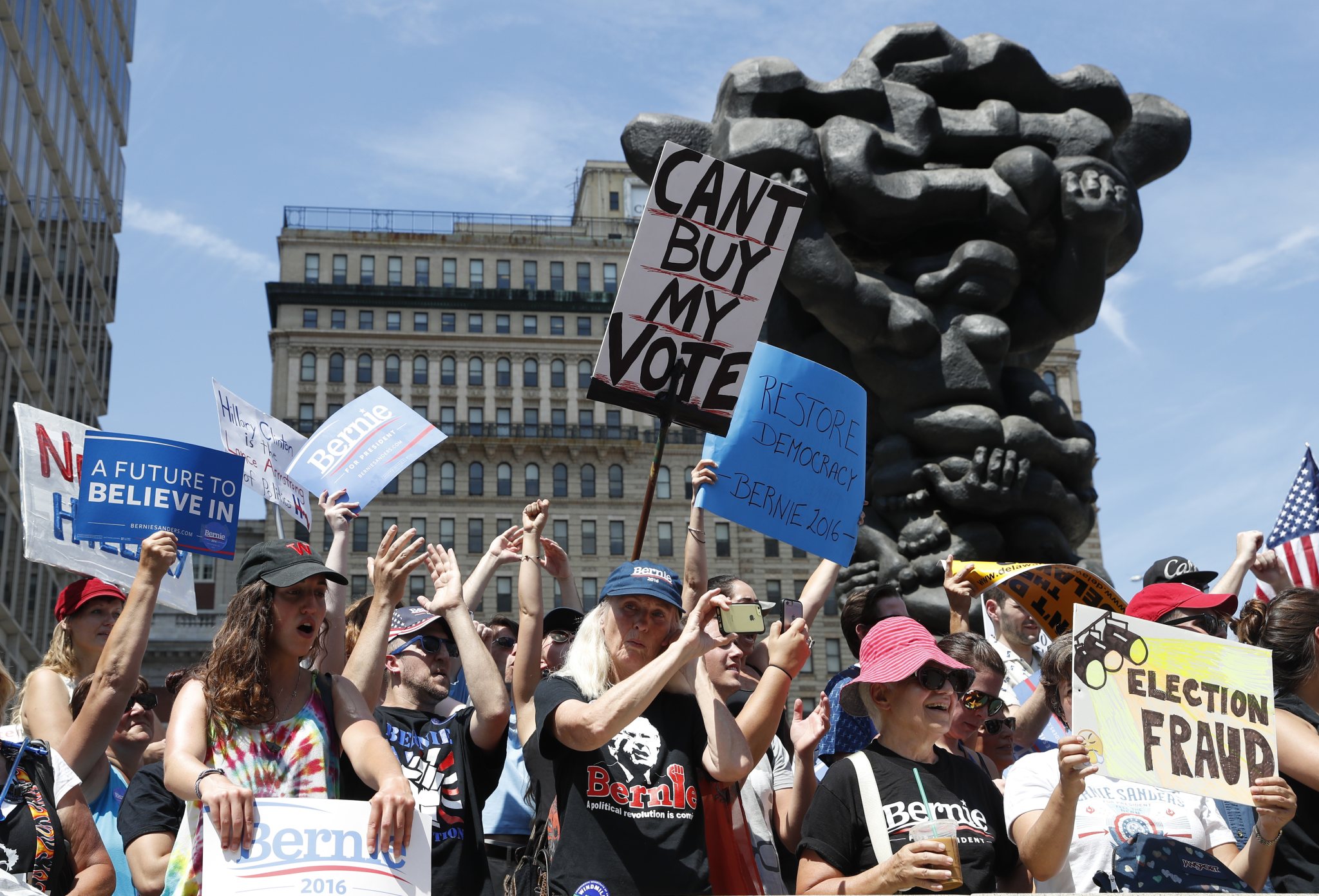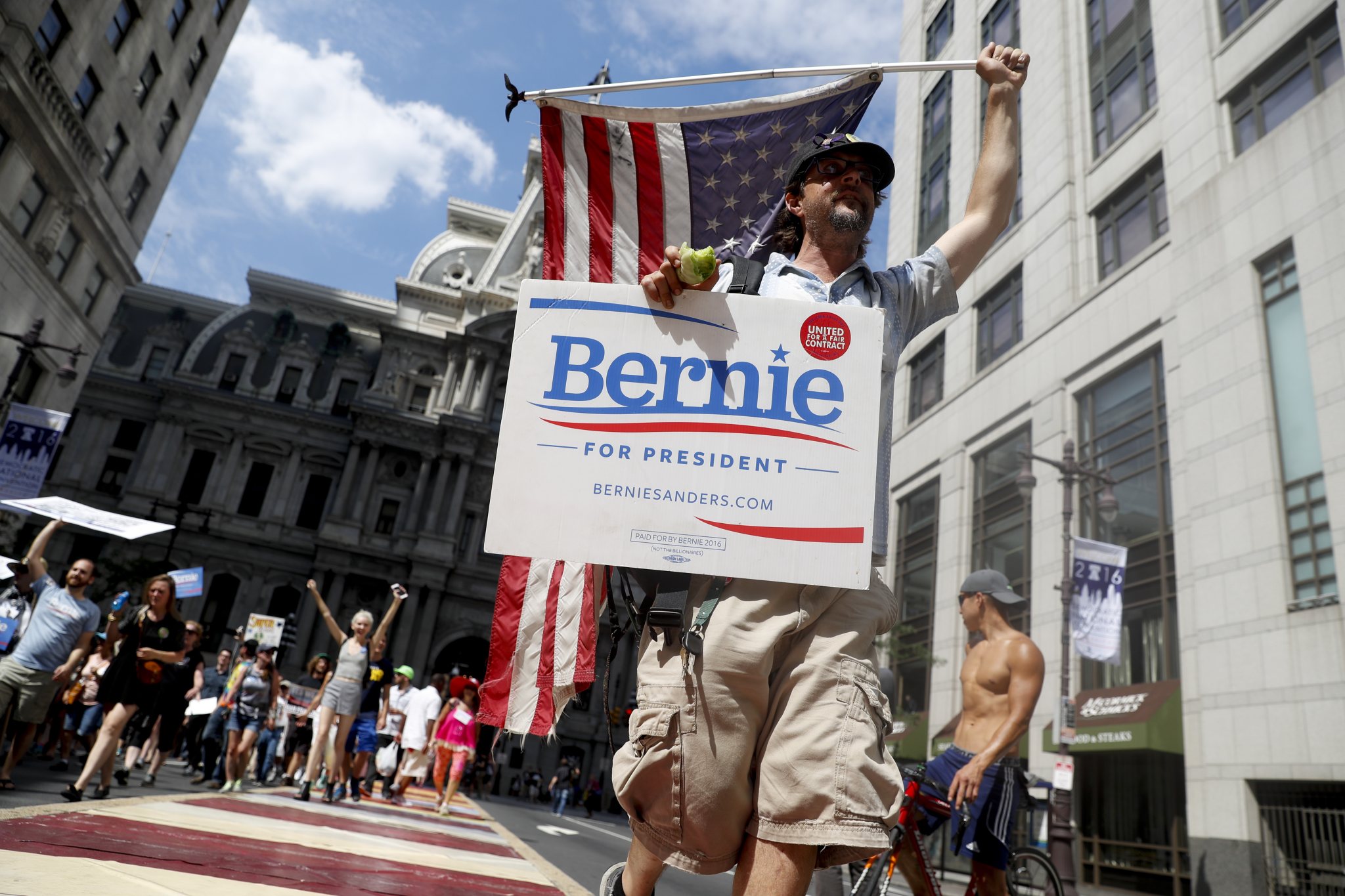 Throngs of Bernie Sanders supporters marched down a main thoroughfare to show their support of him and disdain for Hillary Clinton ahead of the convention.