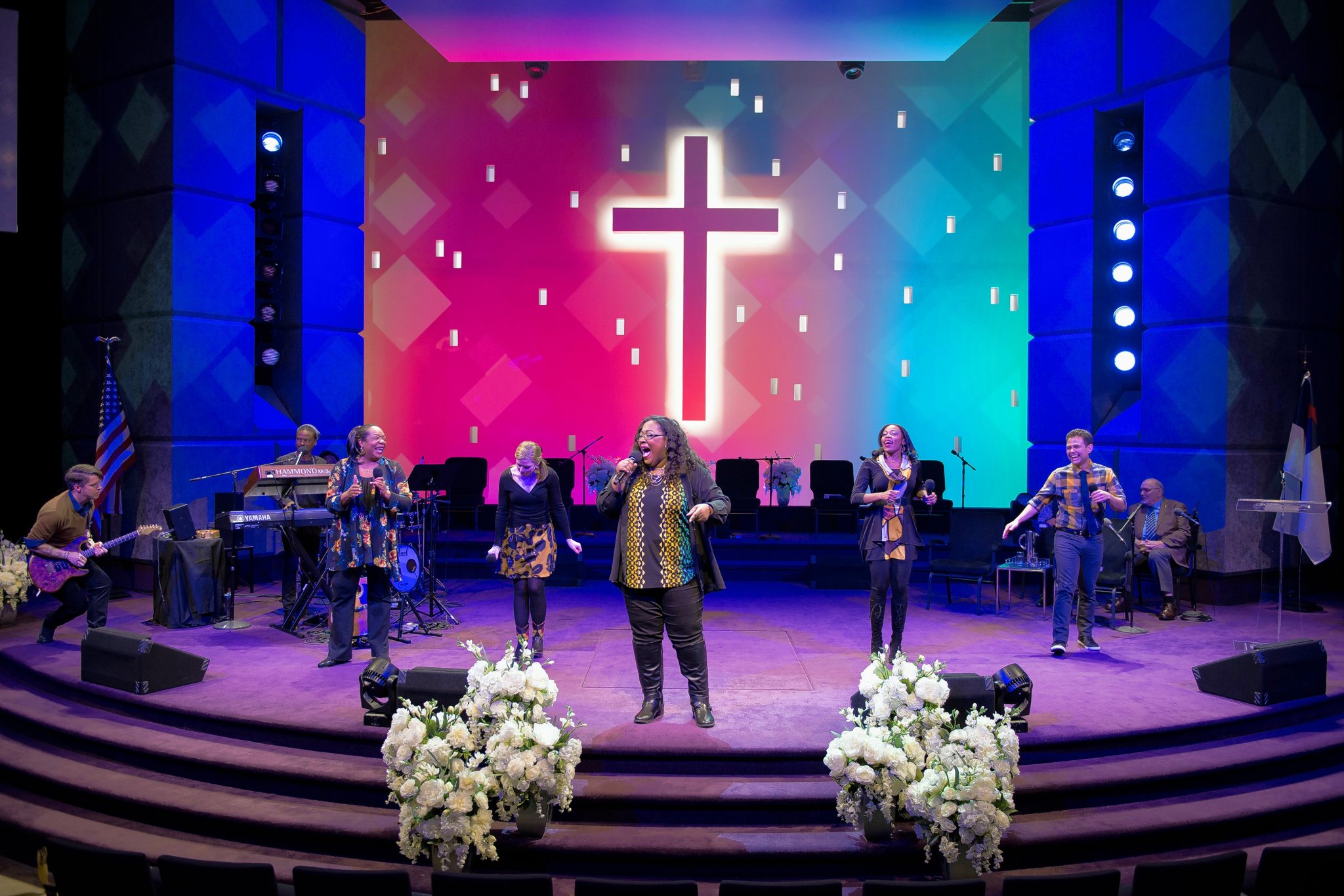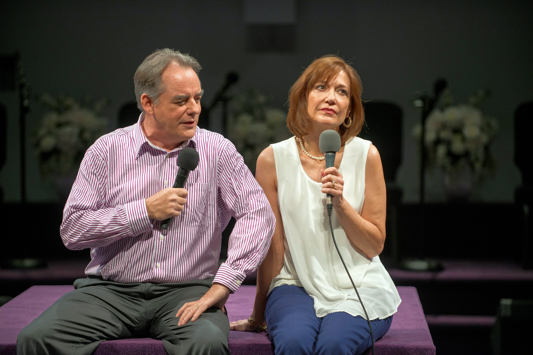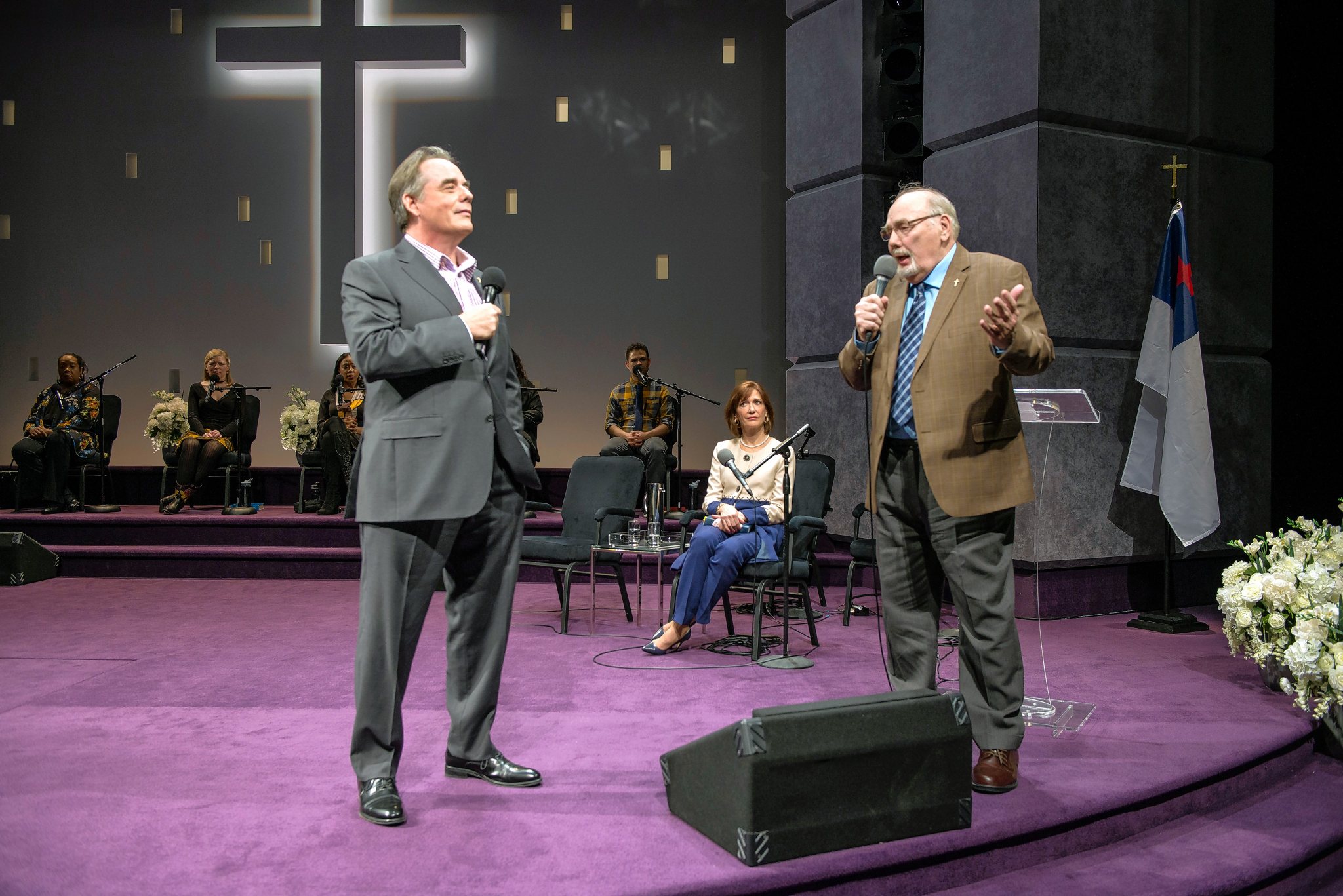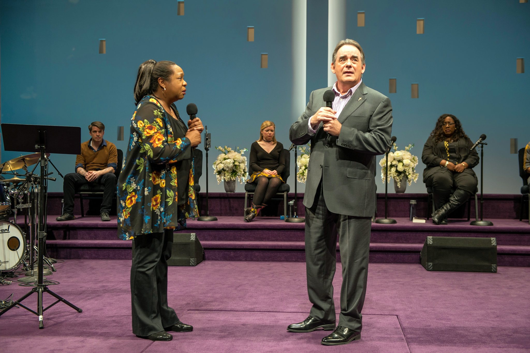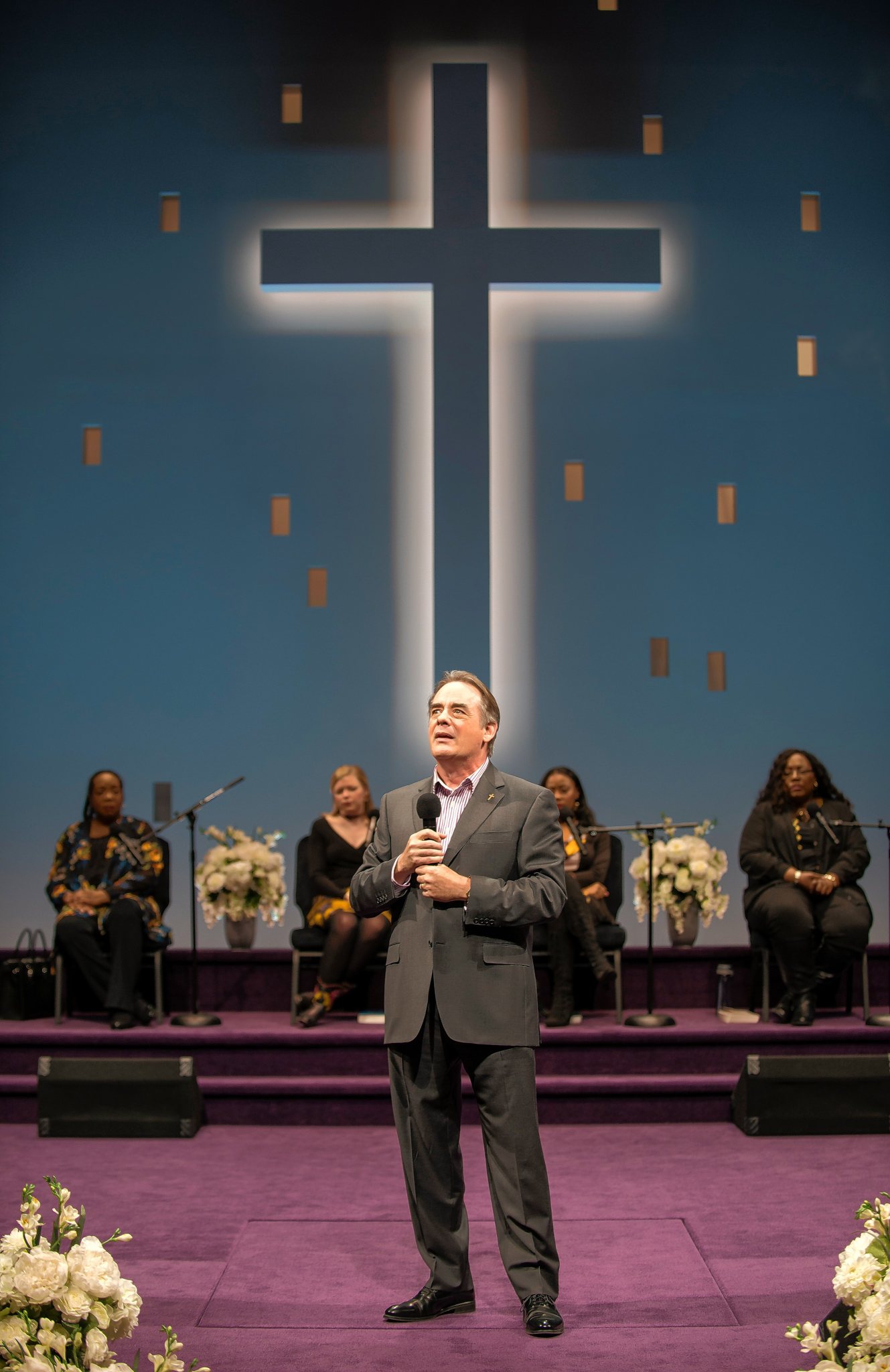 He strides on the stage accompanied by his wife, Elizabeth (Shannon Cochran), associate pastor Joshua (Glenn Davis) and church elder Jay (Robert Breuler). Standing before an enormous cross illuminated by ever-shifting pastels, Paul informs the congregation the church has paid off its debt. He also recalls meeting Elizabeth after slipping her a note that read: “I have a powerful urge to communicate, but I find the distance between us insurmountable.”