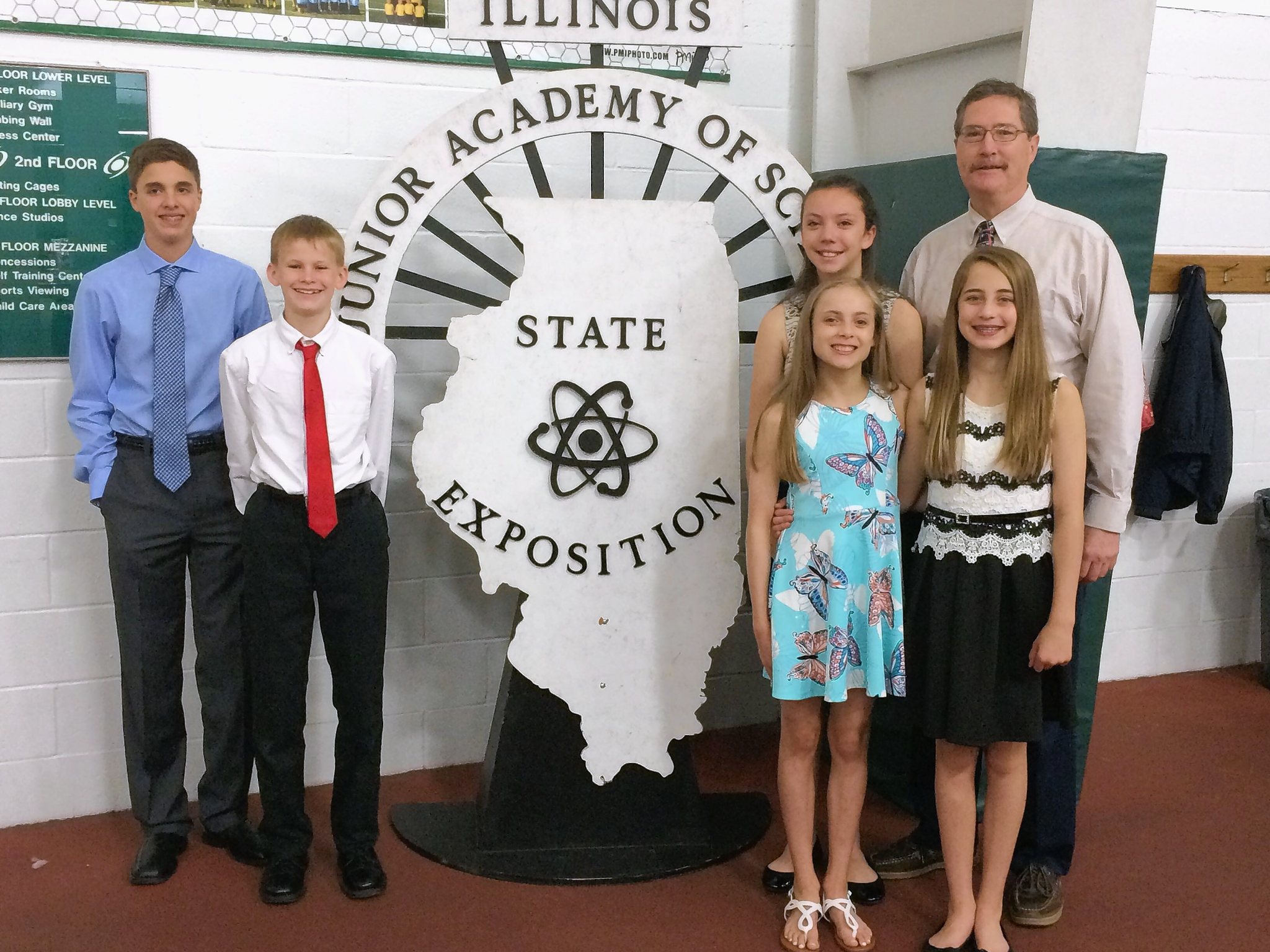 Seventh-graders from St. Peter Lutheran School in Arlington Heights took home four gold awards and one bronze award from the Illinois Junior Academy of Science state science fair competition held at Millikin University in Decatur. They qualified to participate after placing in the top category at the Regional Science Fair held in March. More than 1,200 students from schools across the state took part in the competition. Pictured, from left, are: Ryan Brown, Carson Milligan, Grace Hiller, Kayleigh Rodgers and Tori Nickens, along with Paul Piel, St. Peter science teacher and Northern Illinois District LSMS teacher of the year 2015, at the largest middle school science research competition in the state. (Courtesy of St. Peter Lutheran School)