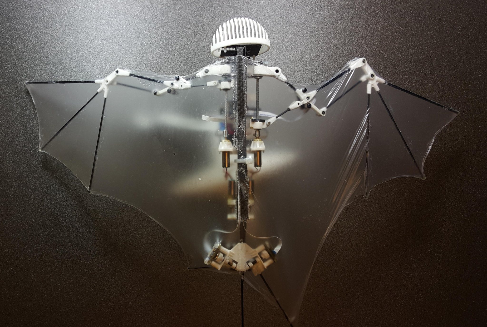 The Bat Bot has nine joints and measures slightly less than 8 inches from head to tail. Its super-thin membrane wings span about a foot and a half. The flexible flapping — as much as 10 times per second — acts “like a big power amplifier,” Hutchinson said.