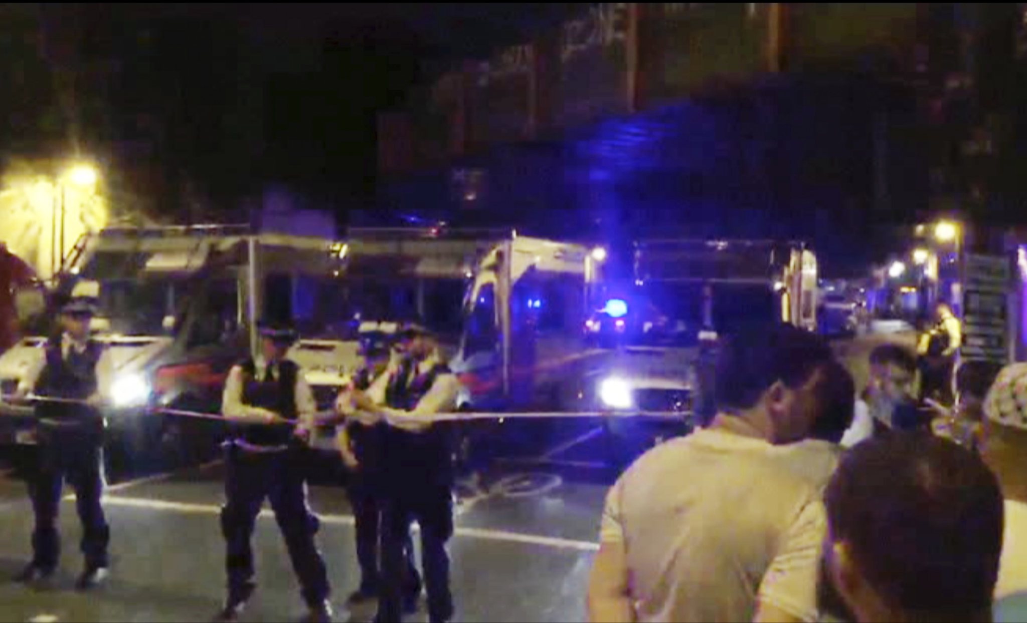 In this image made from video, police officers cordon off the area after a vehicle struck pedestrians near a mosque in London on Monday, June 19, 2017. Metropolitan Police said officers were called to the scene on Seven Sisters Road in north London early Monday morning. Many police cars and ambulances responded to the scene. (AP Photos)