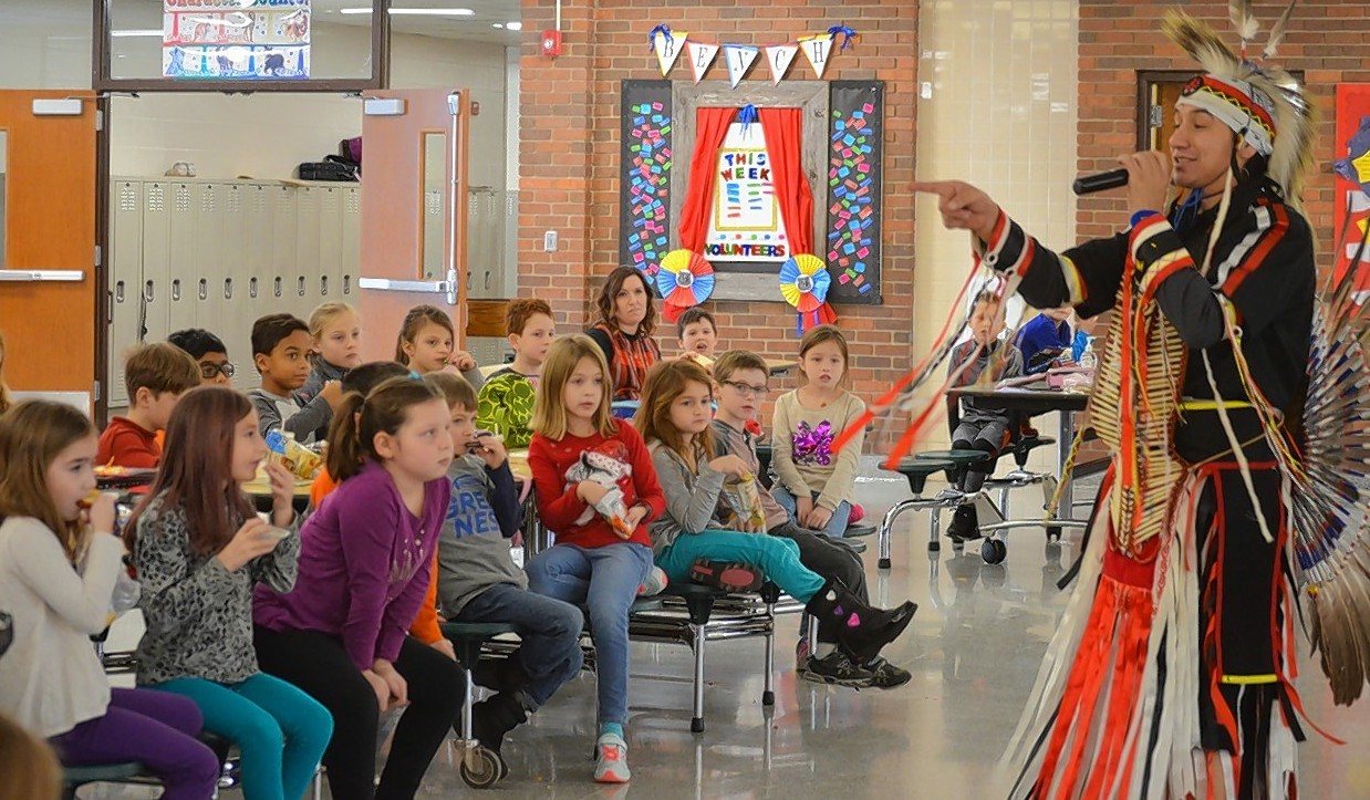 Weylin Webster of the Seneca and Ottawa tribes, affiliated with the American Indian Center in Chicago, recently gave a presentation on his heritage at Butterfield School. (Courtesy of Libertyville Elementary School District 70)