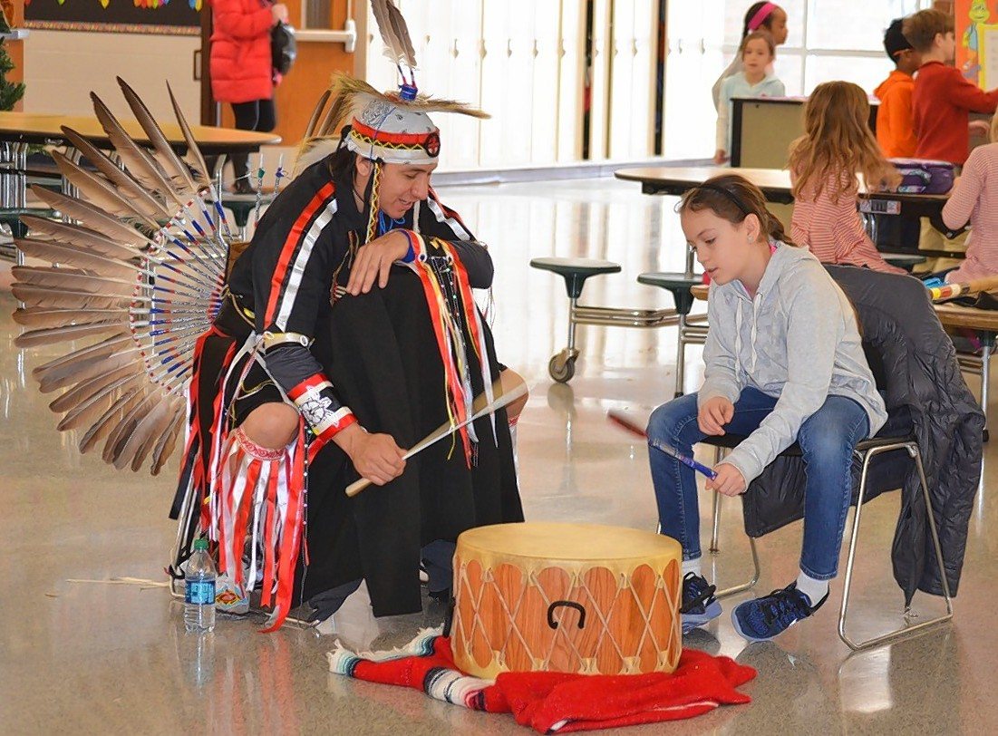Weylin’s 10-year-old daughter, Mizhiike Webster, accompanied her father on the drum during his presentation. (Courtesy of Libertyville Elementary School District 70)