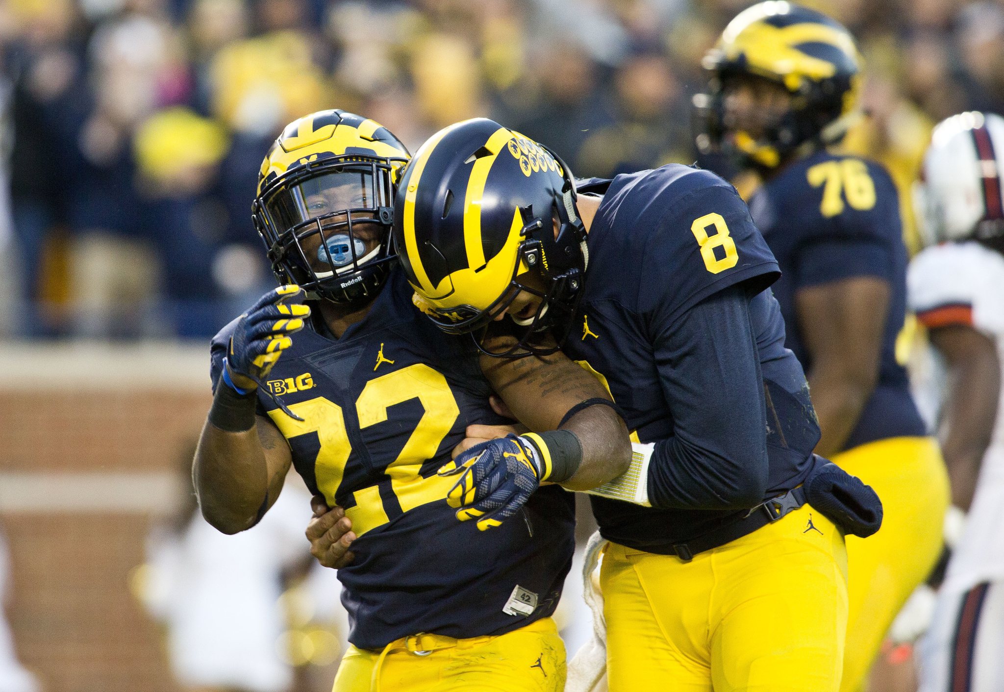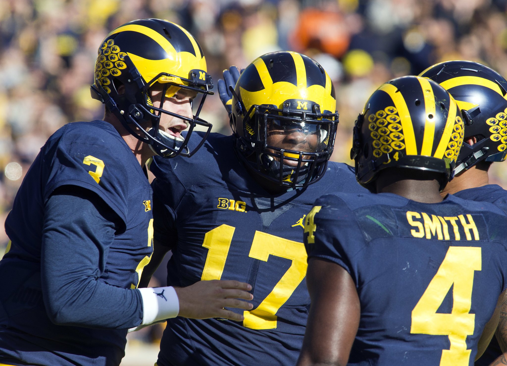 Michigan quarterback Wilton Speight, left, celebrates a touchdown with tight end Tyrone Wheatley (17) and running back De’Veon Smith (4) in the first quarter of an NCAA college football game against Illinois at Michigan Stadium in Ann Arbor, Mich., Saturday, Oct. 22, 2016. (AP Photo/Tony Ding)