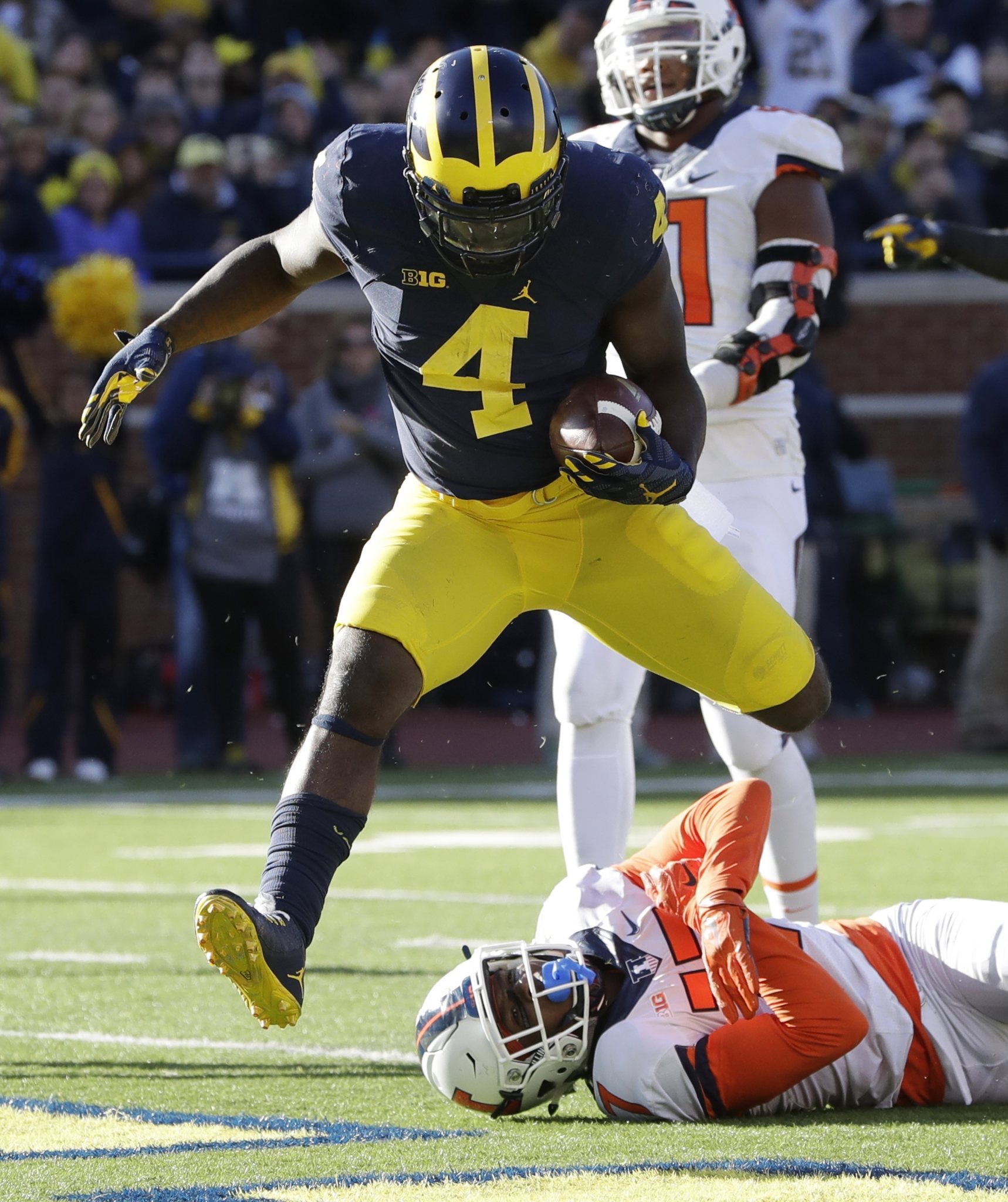 Michigan running back De’Veon Smith (4) leaps over Illinois defensive back Stanley Green for a touchdown during the first half of an NCAA college football game, Saturday, Oct. 22, 2016 in Ann Arbor, Mich. (AP Photo/Carlos Osorio)
