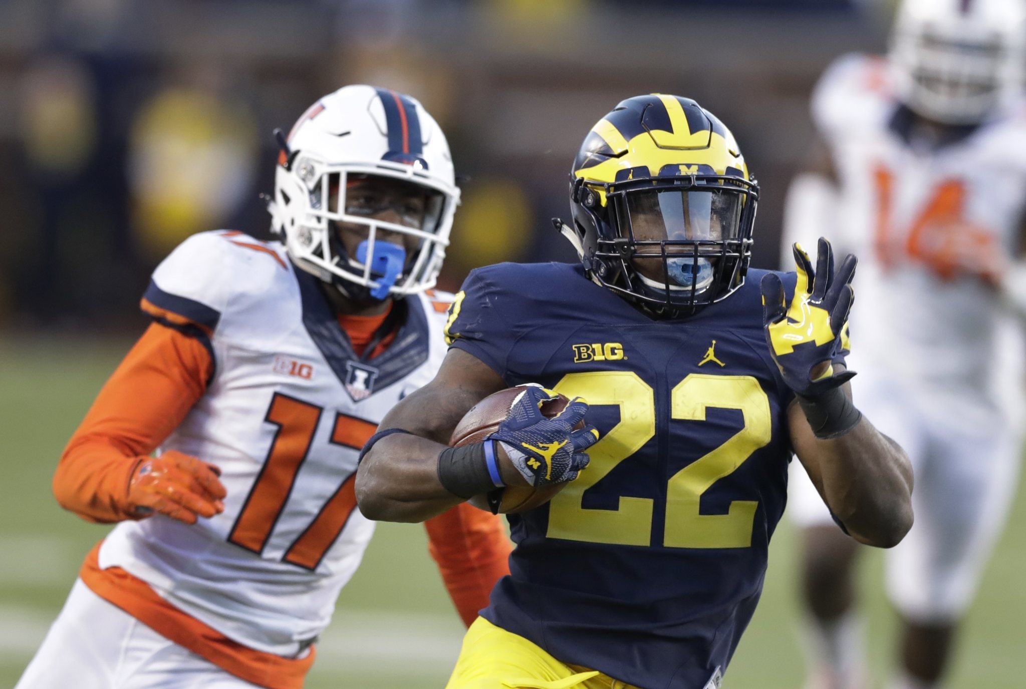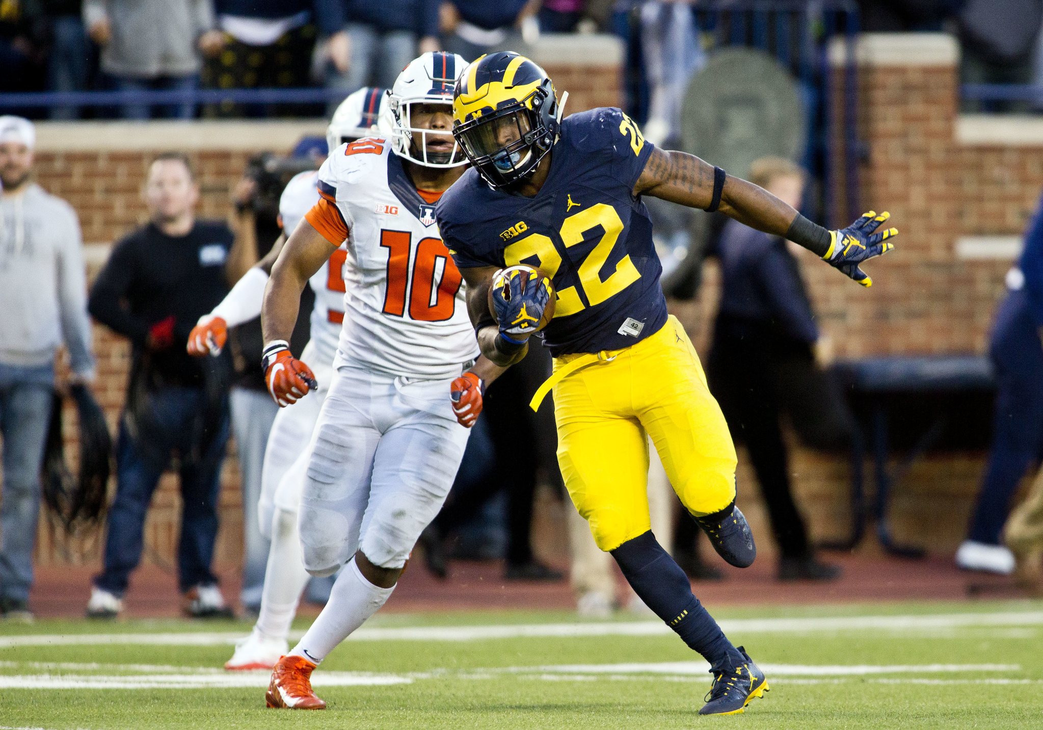 Michigan running back Karan Higdon (22) outruns Illinois defensive back Stanley Green for a 45-yard touchdown run during the second half of an NCAA college football game, Saturday, Oct. 22, 2016, in Ann Arbor, Mich. (AP Photo/Carlos Osorio)