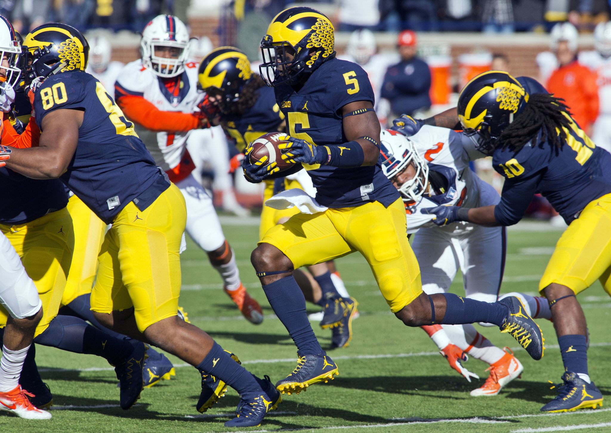 Michigan linebacker Jabrill Peppers (5) returns a kickoff in the first quarter of an NCAA college football game against Illinois at Michigan Stadium in Ann Arbor, Mich., Saturday, Oct. 22, 2016. (AP Photo/Tony Ding)