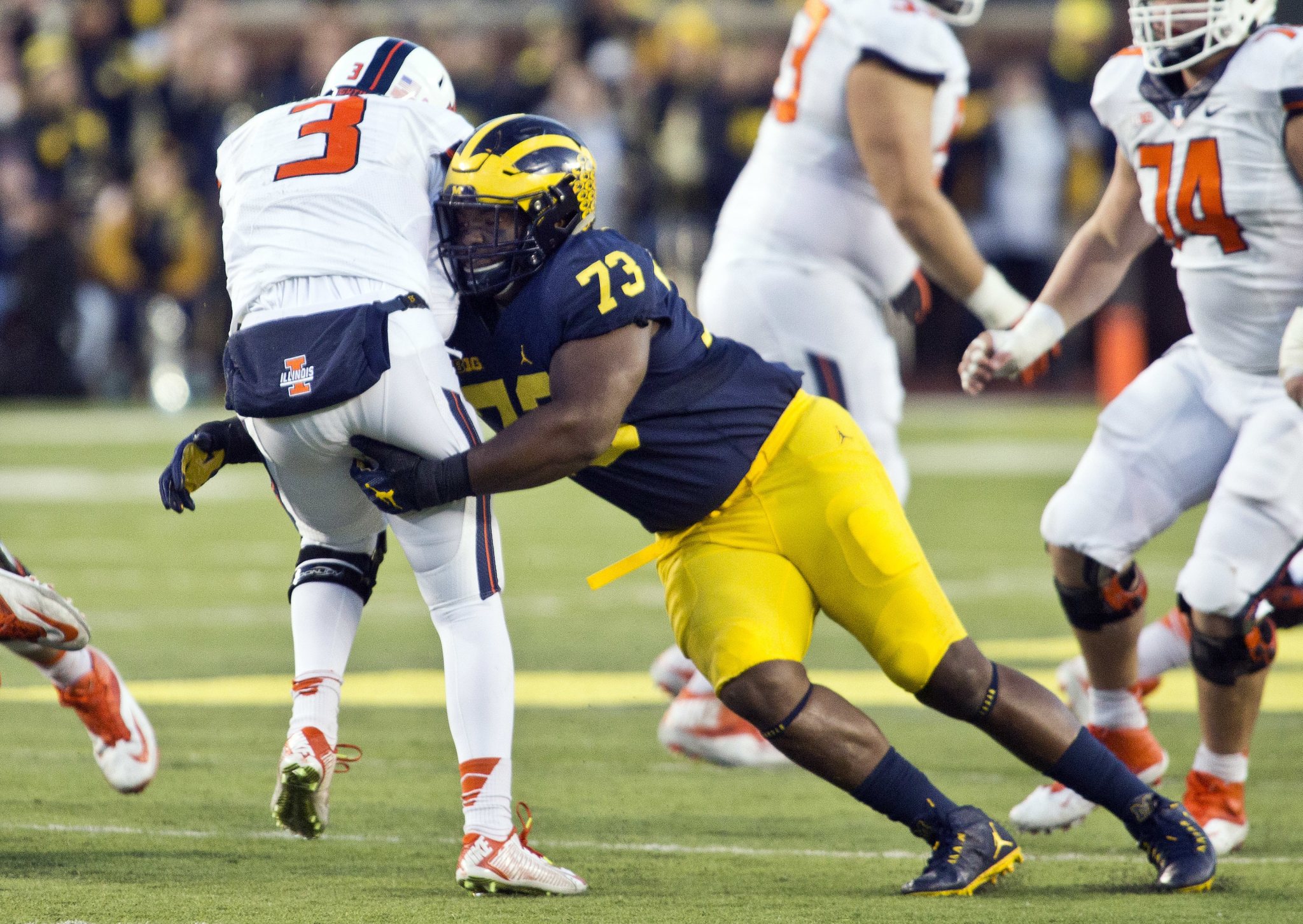 Illinois quarterback Jeff George, Jr. (3) is sacked by Michigan defensive tackle Maurice Hurst (73) in the fourth quarter of an NCAA college football game at Michigan Stadium in Ann Arbor, Mich., Saturday, Oct. 22, 2016. (AP Photo/Tony Ding)